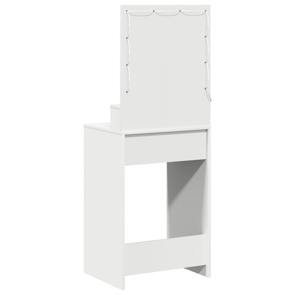 Ez a modern sminkasztal a hálószoba középpontja, ami a funkciót és a stílust ötvözi. A sima fehér felület és a letisztult dizájn tökéletesen helyet biztosít a sminkhez és az ápoláshoz. Nagyszerű kiegészítő bárkinek, aki szeretné feldobni a napi rutinját. Az asztal csodás, jól megmunkált tükörrel rendelkezik, ami segít ellenőrizni a megjelenésed. Az egyetlen fiók segít rendben tartani a sminkedet és kiegészítőidet, megkönnyítve a dolgodat. A lágy LED világítás biztosítja, hogy a legjobb megvilágításod legyen, ami segít a sminkelésnél. Strapabíró műszaki fából készült, így tartós és stabil, miközben a matt felület modern hatást ad neki. A 50 x 41 x 135 cm méretével jól elfér kisebb helyeken anélkül, hogy lemondanál a stílusról. Kérjük, vegye figyelembe, hogy csak tanúsított DC 5V bemenetet használjon. A magasabb feszültség túlmelegedést okozhat, és károsíthatja a készüléket, valamint túlhevülés és tűz kockázatát jelentheti. Ne csatlakoztassa ezt a terméket semmilyen más tápegységhez, mint amit a kézikönyvben, a névtáblán vagy a vidaXL kifejezetten ajánlott. Ezt a készüléket nem használhatják 14 évesnél fiatalabb gyermekek, valamint csökkent fizikai, érzékszervi vagy mentális képességekkel rendelkező személyek, vagy elektronikai eszközök használatában tapasztalatlan vagy tudás nélküli személyek. Az elektromosság veszélyes. A nem megfelelő telepítés, használat vagy módosítás (egyedi alkatrészek cseréje) a készülék károsodásához vezethet, áramütést és veszélyt okozva a felhasználónak. Ne működtesse ezt a terméket robbanásveszélyes atmoszférában, például gyúlékony folyadékok, gázok és por jelenlétében, vagy 50 Celsius foknál magasabb hőmérsékleten. Ne kapcsolja be a terméket, ha a csatlakozó kábel vagy tápegység láthatóan sérült. Ha a lámpa külső hajlékony kábele vagy vezetékje sérült, azt kizárólag a gyártó vagy annak szervizügynöke, illetve hasonló képesítéssel rendelkező személy cserélheti ki, hogy elkerülje a veszélyt. A telepítés és karbantartás alatt kapcsolja ki az áramot. Győződjön meg arról, hogy a fényforrások lehűltek. Ennek a lámpatestnek a fényforrása nem cserélhető; ha a fényforrás elérte élettartamának végét, az egész lámpát ki kell cserélni. Csak belső használatra, ne használja kültéren.