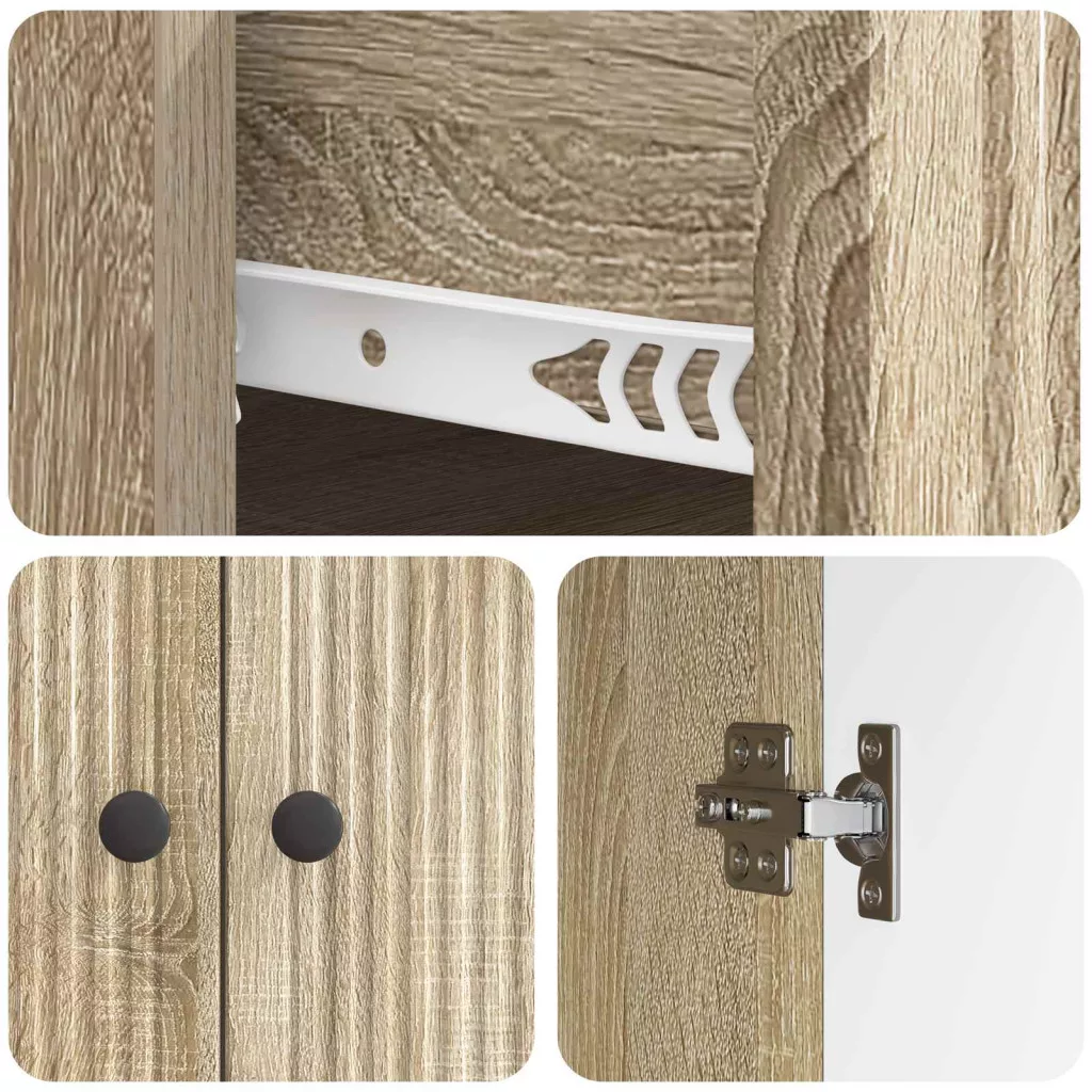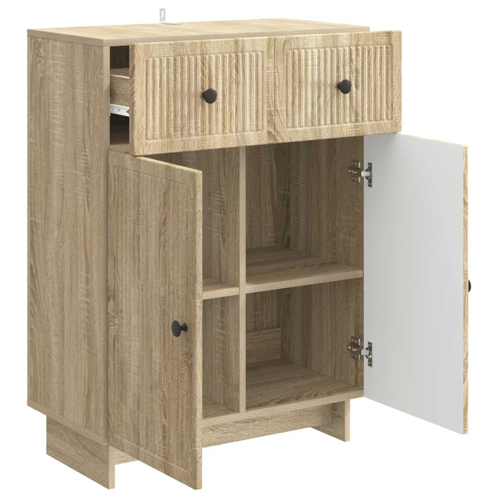 Ez a modern tárolószekrény stílusos és praktikus kiegészítője a nappalidnak vagy étkeződnek, vintage bájjal és rengeteg tárolási lehetőséggel. Téglalap alakú, robosztus fa anyagból készült, tökéletesen illik bármilyen stílushoz, feldobva a helyiséget. Akár egy szép kiállítást, akár praktikus tárolást keresel, ez a bútor modern eleganciával gazdagítja a teret. Szerelt fa építés: Ez a tárolószekrény robosztus fából készült, így tartós és hosszú élettartamú. A sima felülete vonzó és könnyen tisztán tartható, ami ideálissá teszi a forgalmas otthonokban. Ellenáll a torzulásnak és repedezésnek, megbízható struktúrát biztosít. Bőséges tárolóhely: A tárolószekrény több polccal és tágas fiókokkal rendelkezik, valamint 90°-os lengőpántos ajtókkal. Ezek a funkciók sokoldalúságot nyújtanak az étkezők textíliái vagy a személyes tárgyak rendszerezésében, rendet tartva. Vintage stílus: Ez a bútor vintage dizájnt tükröz, ami elegáns megjelenést kölcsönöz a modern belső tereknek. Időtlen eleganciája jól illik a hagyományos és kortárs dekorációhoz, míg a fém gombkilincsek könnyű használatot kínálnak. Biztonságos és stabil: A biztonság érdekében a mellékelt fali rögzítő segít elkerülni a felborulást. Nyugalmat biztosít, különösen, ha kisgyerekek vagy háziállatok is vannak, anélkül, hogy az egység dizájnjába beavatkozna. Könnyű karbantartás: A tárolószekrény felülete könnyen tisztítható – csak töröld le nedves ruhával, hogy megőrizd szépségét. Minimális gondozással a tisztaság és a megjelenés is megmarad, így mindig középpontban marad.,