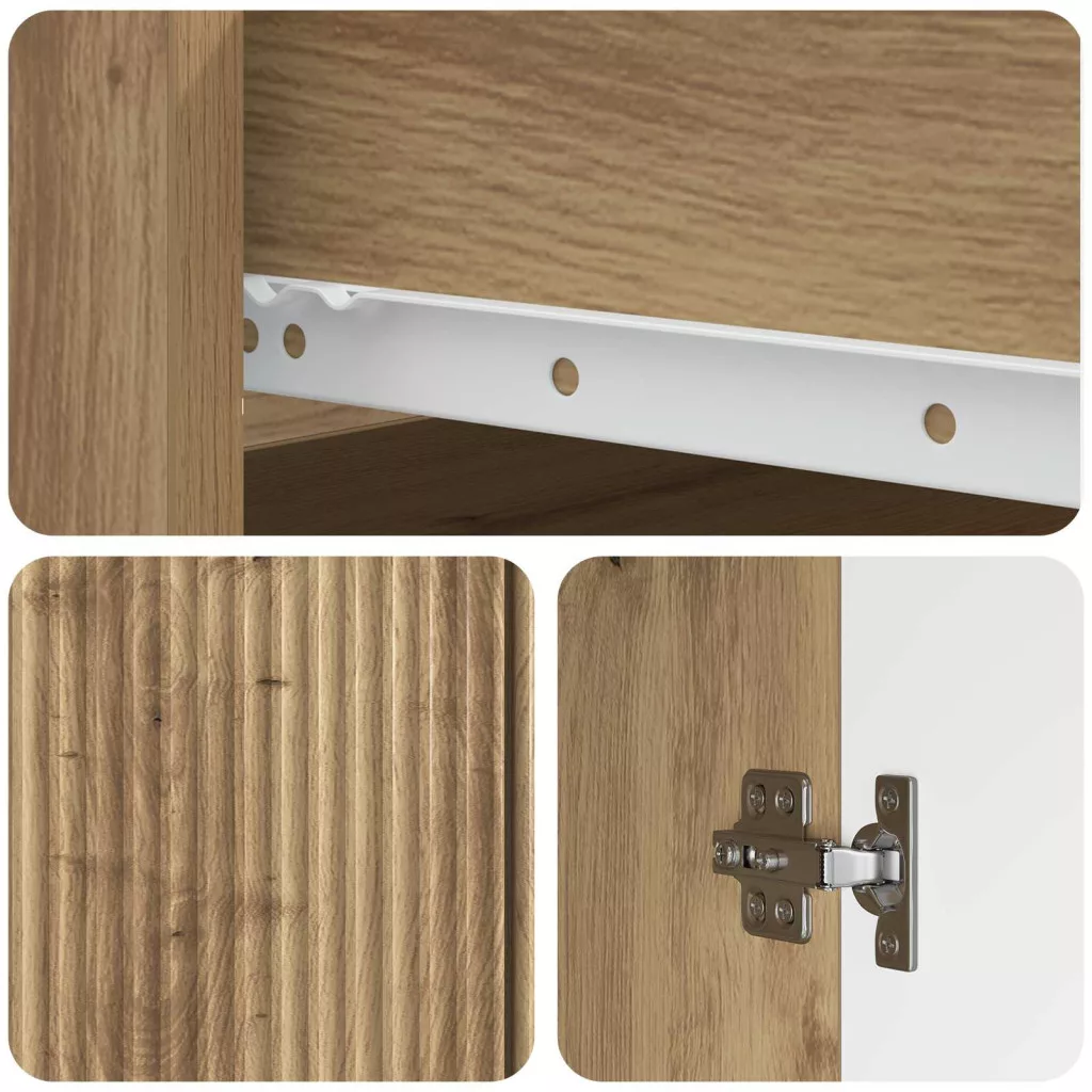 Ez a modern oldalasztal tökéletes kiegészítője bármely nappalinak, hiszen stílus és funkció is van benne. Mérnöki fából készült, vintage stílusa egy régi kor eleganciáját idézi, miközben rengeteg tárolási lehetőséget ad a mindennapokra vagy különleges alkalmakra. Mérnöki fa építés Tartós mérnöki fából készült, ez az oldalasztal nemcsak robusztus, hanem szép is. Az ajtók, a fiókok, a polcok és a lábak mind egyedi stílust és erőt képviselnek, így tökéletes választás lehet bármilyen otthonba vagy étkezőbe. Ez a stílusos oldalasztal: Az oldalasztal úgy lett megalkotva, hogy simán beilleszkedjen a nappalidba vagy étkeződbe, nosztalgikus hangulatot teremtve vintage stílusával. A keskeny lábformája pedig jól illik a modern belső terekhez anélkül, hogy elveszítené egyedi karakterét. Praktikus összetevők: A deszkákból készült polcokkal, 90 fokos lengőajtókkal és ügyes fiókokkal az oldalasztal felhasználóbarát tárolási megoldásokat biztosít. Élvezd a praktikát, hiszen minden elem könnyen hozzáférhető és segít a rendben tartásban. Intuitív karbantartási útmutató: A tisztításhoz elég egy nedves ruhát használni, ami segít megőrizni az oldalasztal tiszta kinézetét. Ezek az egyszerű karbantartási lépések biztosítják, hogy a tárolóbútorod évekig szép és tartós maradjon. Összeszerelési követelmények: Az összeszerelés pofonegyszerű, csak két ember és néhány alapvető szerszám, például csavarhúzó meg kulcs kell hozzá. A mellékelt fali rögzítők biztosítják, hogy a bútordarab stabilan álljon a mindennapi használat során.