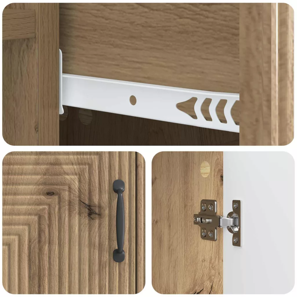 Ez a modern tálalószekrény a vintage báját vegyíti a jelenkori praktikummal, és ideális választás étkezőkbe vagy nappalikba, ahol stílusra és tárolásra van szükség. Sokoldalú dizájnja remekül beleillik a vintage környezetekbe, miközben sok tárolóhelyet kínál a nyüzsgő mindennapokhoz. Sokoldalú anyagok A műszaki fából készült szekrény stabil szerkezetet és elegáns megjelenést biztosít, így remekül mutat a nappaliban. Tartós felépítése miatt hosszú élettartamra számíthat vele. Átfogó tárolási lehetőségek Fali polcokkal és fiókokkal felszerelve, bőséges helyet biztosít a tárolásra. A lengőajtók segítségével könnyen elrejtheti a rendetlenséget, miközben kéznél vannak a szükséges dolgok. Gondos tervezés A modern fém lábak és bárfogantyúk esztétikailag vonzóvá teszik, és könnyen illenek bármilyen otthon stílusához. A szekrény stabil, a fogantyúk pedig segítenek a könnyű hozzáférésben. Praktikus használat Ez a tálalószekrény ideálisan alkalmazható nappaliban, étkezőben vagy egyéb belső terekben, és jól passzol a klasszikus és kortárs stílusokhoz egyaránt. Rugalmassága miatt könnyen beilleszthető bármilyen otthonba. Könnyű karbantartás Csak egy nedves ruhával kell áttörölni, így szép állapotban tartható, minimális karbantartást igényel. Ez a könnyű ápolás biztosítja a hosszú élettartamot és a funkcionalitást.