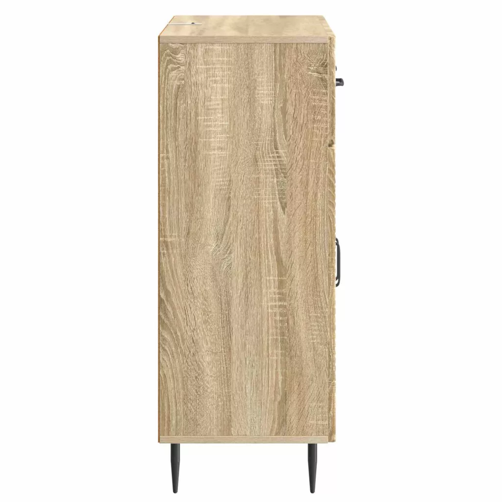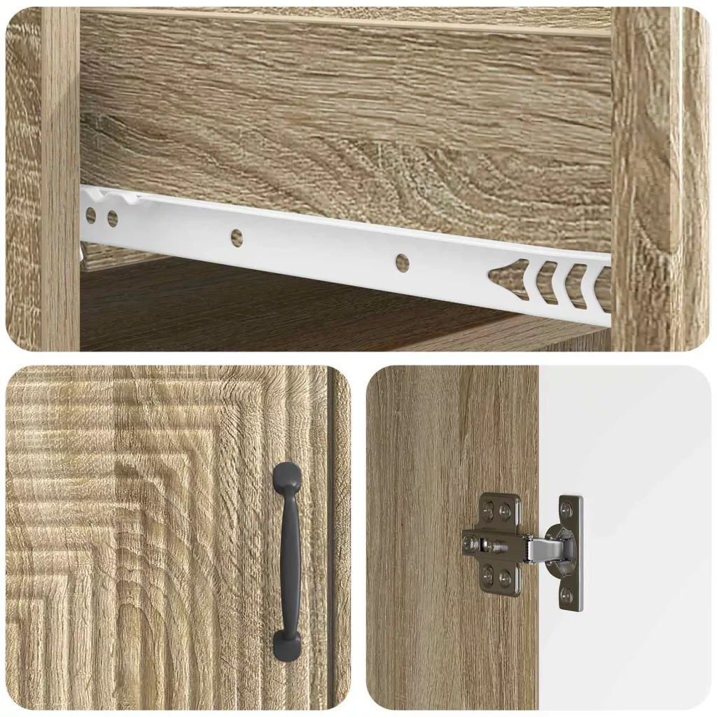Ez a Modern Tálaló ötvözi a vintage esztétikát a modern dizájnnal, így elegáns megoldást kínál az otthoni rendezettséghez. Téglalap alakja jól illik bármilyen környezetbe, stílusos bájt kölcsönözve az étkezőknek vagy nappaliknak. Praktikus és stílusos, ez a tálaló kielégíti a különféle tárolási igényeket, tökéletes választás azoknak, akik szeretik a funkcionalitást és a dizájnt. Mérnöki Fa Kivitelezés A tálaló teste teljesen mérnöki fából készült, ami tartós és környezetbarát. Az anyag sima, stílusos felületet biztosít, ami tökéletes a rendezett megjelenéshez, így bármely időszakban csak rá kell nézni. Polcok & Fém Lábak Robusztus polcokkal és elegáns keskenyedő fém lábakkal rendelkezik; a fekete szín stabilitást és stílust ad a konstrukciónak, így nagy súlyt is képes elbírni anélkül, hogy a dizájn rovására menne. 90°-os Lengőajtó & Fiók A lengőajtók jobban hozzáférhetővé teszik a tárolót, míg a jól megtervezett fiók extra zárt tárolást biztosít. Tökéletes az apró dolgok rendezésére és a rendezettség fenntartására. Sokoldalú Használat & Bőséges Tárolás Ez a tálaló elengedhetetlen, ha bőséges tárolást keresel. Ideális az étkészletek és asztalterítők rendezésére, jól illeszkedik bármilyen térbe, így praktikus és szép megoldás étkezőbe vagy nappaliba. Egyszerű Ápolás & Összeszerelés A felület karbantartása pofon egyszerű, csak egy nedves ruhára lesz szükséged. Az összeszereléshez két ember elég csavarhúzóval, így nem okoz gondot a biztonságos és rendezett megjelenés elérése otthonodban.