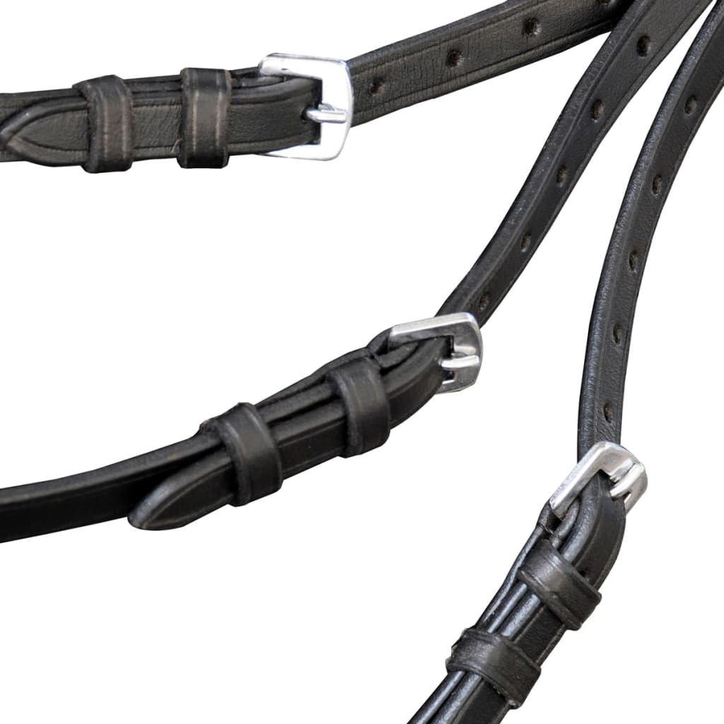 Ez a kantár kiváló minőségű bivaly bőrből készült. Extra puha és bélelt fejpánttal rendelkezik a legkényelmesebb illeszkedés érdekében. A finom tervezésének és a hajlított orrszíjának köszönhetően, e kantár nem csak elegáns hanem biztosítja az egyenlő nyaki nyomás elosztást. Hosszúsága állítható a 7 különböző szinthez. Tartalmazza a kantárt zablával és egy gyűrűs csikózablát.