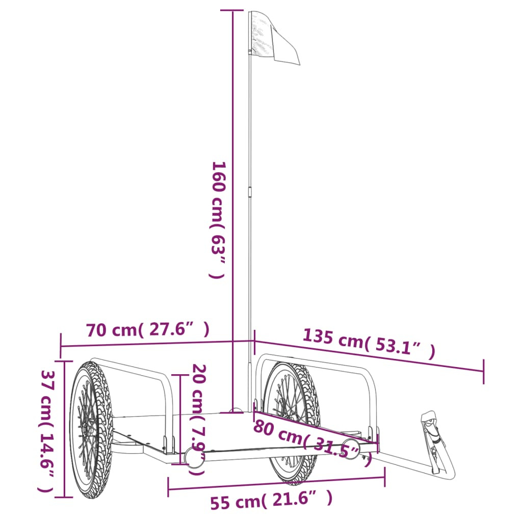 Ez a sokoldalú és masszív kerékpár-utánfutó ideális nehéz áruk szállítására a 45 kg-os maximális teherbírásának köszönhetően. Erős anyag: A vas erős és kemény anyag. Az egyik kedvenc tömör anyag az építőiparban és bútorgyártásban. Ez a vasból készült kerékpár teherszállító utánfutó rendkívül erős és strapabíró.Praktikus kialakítás: Ez a bicikli-utánfutó 45 kg-s maximális terhelhetőségével tökéletesen alkalmas nehéz áruk, például csomagok, növények, szerszámok vagy élelmiszerek szállítására.Átgondolt kialakítás: A kerékpár-utánfutó vonóhoroggal rendelkezik, amely megkönnyíti a kerékpárhoz való csatlakoztatást. Ugyanakkor egy biztonsági zászlót is tartalmaz az extra láthatóság érdekében. A világításra, reflektorra stb. lehetnek helyfüggő jogi követelmények. Kövesse a helyi és jogi előírásokat.