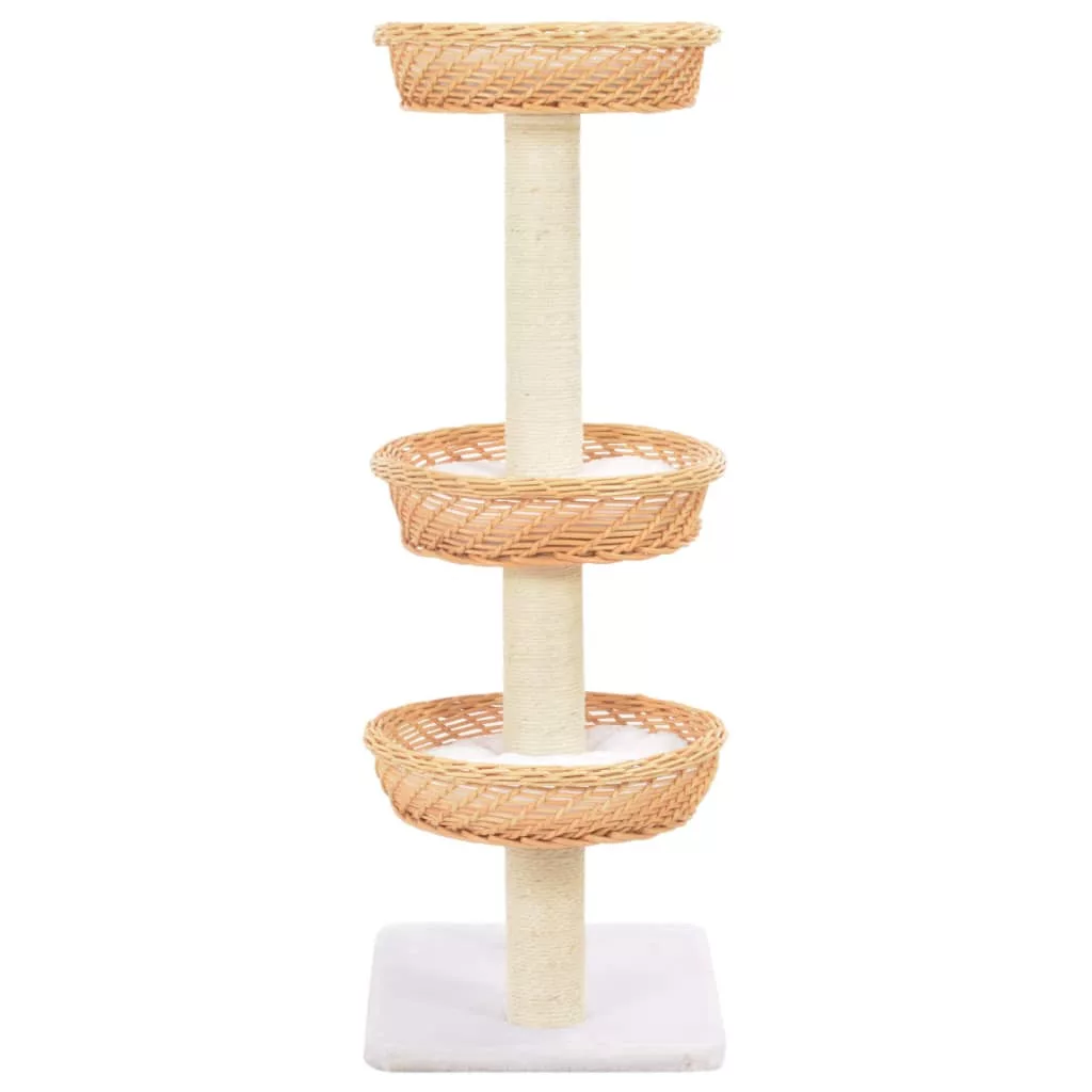 Ezen a kézzel készített macskabútoron macskái kedvük szerint kaparászhatnak, elrejtőzhetnek, mászkálhatnak és lazíthatnak. Aranyos és kompakt kialakításának köszönhetően ez a macskabútor minden otthonba illeni fog. Ez a macska kaparófa nagyszerű lehetőséget kínál kis kedvenceinek, hogy nyújtózzanak vagy edzésben maradjanak, különösen a hideg, téli hónapok során, amikor be vannak zárva a lakásba. A kaparófák kényelmes szizálkötéllel lettek körbetekerve, így amellett, hogy kényelmesek, ideálisak arra, hogy szőrös kis barátai rajtuk élesítsék a karmukat. Macskabútorunk 3 kényelmes fűzfavesszőből font kosárral is rendelkezik, ahol cicája szundíthat vagy pihenhet egy jót. Emellett levehető párnák is találhatóak rajta, melyeken macskája kényelmesen elfekhet. Ez a természetes fából készült macskabútor egyszerűen összeszerelhető és karbantartható.