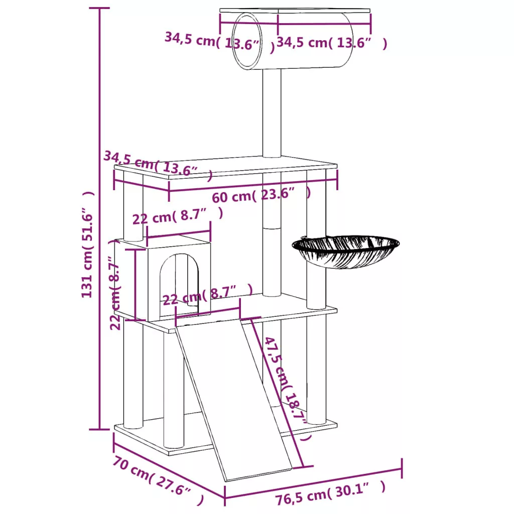 Legyen határtalan szórakozásban részük szeretett cicáinak ezzel az univerzális macskakaparó fával! Minden egyben macskatorony: A többszintes macskabútor 1 házzal, 1 függőággyal, 1 alagúttal, 1 létrával és emelvényekkel lett ellátva, tökéletes helyet biztosítva macskáinak a mászáshoz, kaparáshoz, bujkáláshoz és pihenéshez.Puha plüss anyag: Az extra vastag és puha plüss jól szellőzik, karcálló, rendkívül kényelmes és meleg.Tartós szizáloszlopok: A kaparófa rugalmas és erős, természetes szizáloszlopai tökéletesek szeretett macskái számára, hogy kielégítsék kaparóösztönüket, és ne a bútorait karcolják meg. Megjegyzés:Az egyszerű összeszerelés érdekében minden termékhez mellékelünk összeszerelési útmutatót.