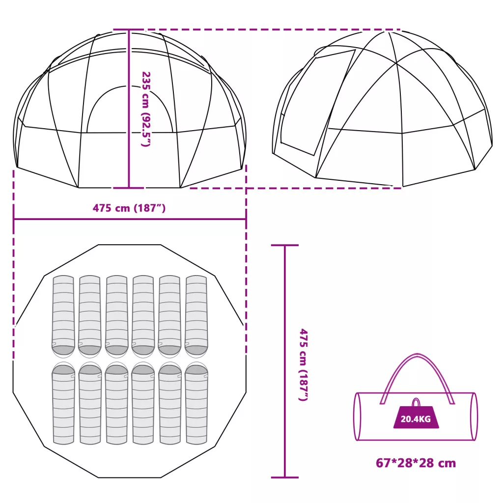 A Kültéri Kemping Dóm Sátra a családoknak és csoportoknak készült, hogy kényelmes és praktikus kempingélményt nyújtson a nyári időszakban. Modern, letisztult dizájnja és dóm formája stabilitást és stílust biztosít. Tökéletes hely a szabadba vágyóknak, összeköti a szépséget és a funkciót, így bármilyen kempingezési élmény szuper lesz. A tágas belső tér ideális a családoknak és a cuccoknak, így kényelmes helyet teremt a kalandok tervezéséhez és emlékek készítéséhez. Tartós poliészter anyag Vízálló poliészterből készült, ami megvéd a váratlan esőzésektől, és közben a belső teret kellemesen tartja. Ez a strapabíró anyag biztosítja, hogy a sátor bírja az időjárást, megbízható menedéked lesz kempingezés közben. Tágas belső tér 475 x 475 x 235 cm-es méretével rengeteg hely jut a családodnak és a kempingező cuccaidnak, szóval mindenki kényelmesen alhat. A nagyobb tér lehetővé teszi, hogy dőlj hátra és élvezd a pihenést, miközben tervezed a következő kalandokat. Könnyen szállítható és összecsukható A sátor egyszerűen összecsukható, így könnyen viheted és tárolhatod. Tökéletes kempingezőknek, akik gyorsan szeretnének felállítani és pakolni, így spórolhatsz az idővel és energiával a kempingezés helyszínén. Évszakoknak megfelelő Bár elsősorban nyári használatra készült, jól kezeli a meleg időt, és bent hűvösen tart, szóval nagyszerű nyári bulikhoz. Kényelmesen alkalmazkodik a különböző szabadtéri környezetekhez, így javítja a kempingelés élményét szinte bármilyen időjárás mellett. Egyszerű karbantartás Csak száraz törlőkendővel tisztán tarthatod, kerüld a kemikáliákat. Amikor nem használod, tárold száraz helyen, hogy a következő sok közös kempingezés során is jó állapotban legyen. Figyelmeztetés Tartson távol minden láng- és hőforrást ettől a termékszövettől.