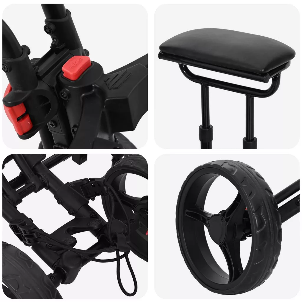 Ez a modern golfkocsi a tartósságot, kényelmet és könnyen mozgathatóságot ötvözi, hogy a golfélményt tényleg feljavítsa. Szilárd matt bevonatával és összecsukható kialakításával kifejezetten hosszú távú használatra készült, miközben könnyen tárolható. A simán gördülő kerekek lehetővé teszik, hogy bármilyen terepen egyszerűen mozoghass. Emellett könnyen összeszerelhető, így nem lesz más dolgod, mint játszani! Gyakorlatias, megbízható és szuper stílusos, ez a kocsi tényleg a tökéletes társad a zölden. Stabil és tartós váz Erős alumínium kerettel készült, így a golfkocsi stabilan tartja a golftáskádat minden alkalommal. A szilárd felépítés ellenáll a heti kihívásoknak, miközben naprakész és modern megjelenése van. Összecsukható kialakítás Kényelmi megoldásként tervezve, a kocsi egy összecsukható struktúrával rendelkezik, ami megkönnyíti a gyors szállítást és tárolást. Egyszerűen összecsukható, nem foglal el felesleges helyet. Kényelmes fogantyú Ergonomikus PVC fogantyúval, a kocsi kellemes fogást biztosít tolás vagy kormányzás közben. A fogantyú kialakítása csökkenti a kézterhelést, és jobb irányítást ad, amikor áthaladsz a pályán. Biztonságos és stabil használat A golftáska rugalmas hevedere stabilan tartja a felszerelésed mozgás közben. A lábfék biztosítja, hogy a kocsi ne mozduljon el, amikor leparkolsz a lejtőt vagy a rossz talajt. Ülőhely és pontozó Az integrált ülőhely kényelmes pihenést biztosít a hosszú körök alatt. Van hozzá egy fejlett golfpontozó is, hogy könnyen nyomon követhesd a pontokat, amíg a játékra összpontosítasz.