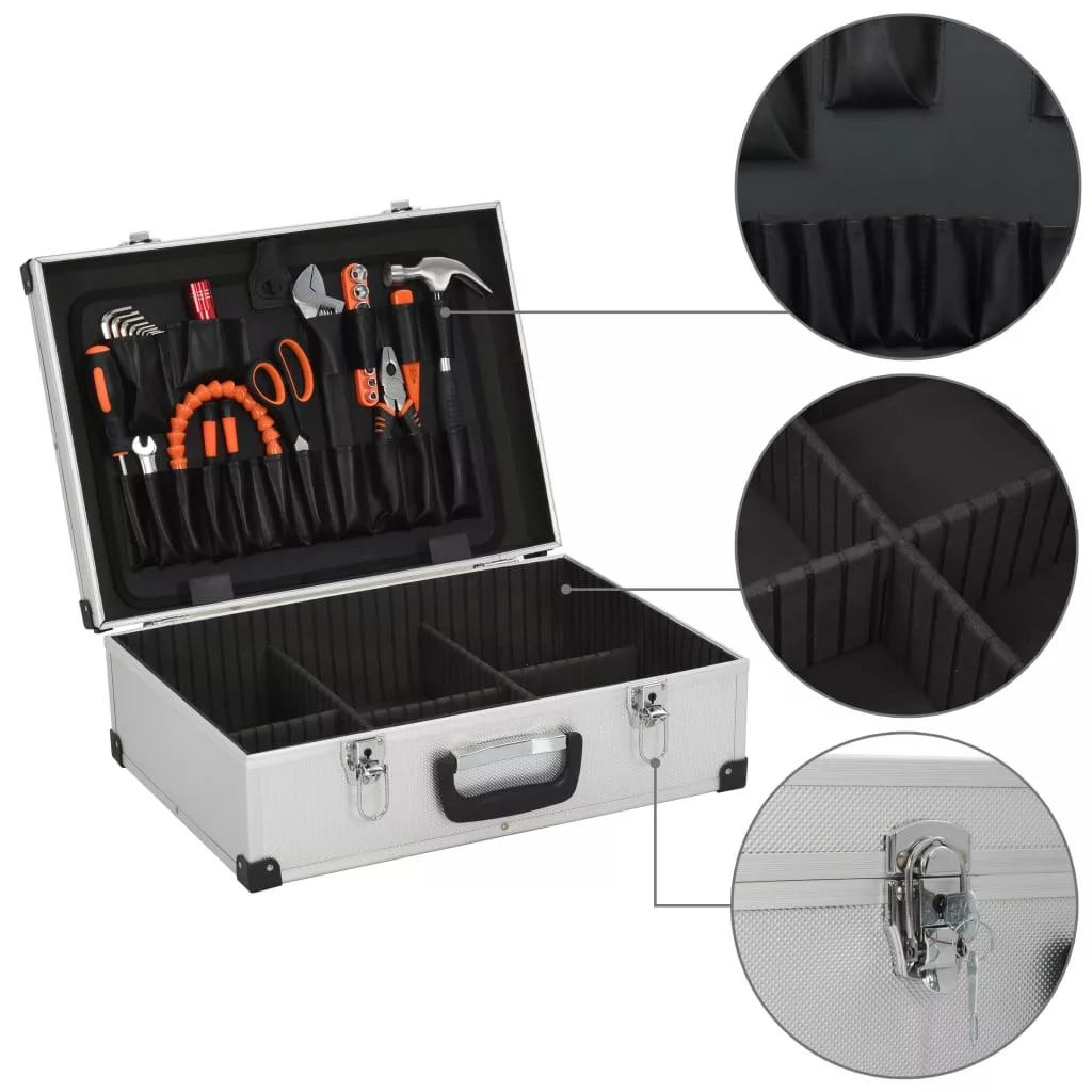 Tartsa az összes szerszámát tisztán és rendezetten ebben a texturált alumínium szerszámosládában! A fából, ABS lemezből és alumíniumból készült szerszámosláda vízálló és tartós. Az extra szilárdság érdekében megerősített alumínium trimmeléssel készült. Az alumínium szerszámosláda 6 rekeszből és 17 zsebből áll, amelyek tágas helyet biztosítanak az összes szerszám, például csavarhúzó, fogó és villáskulcs megfelelő rendszerezésére. A szerszámosláda a mellékelt kulccsal zárható a biztonságos tárolás érdekében. A beépített kényelmes fogantyú segítségével az összes szerszám egyszerűen szállítható. Tárolja és szállítsa szerszámait a hordozható szerszámosládánkban!