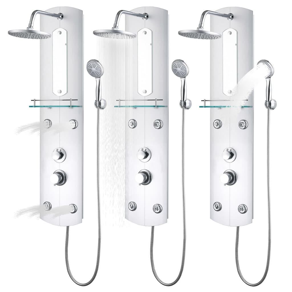 Ez a stílusos, többfunkciós zuhanyrendszer fürdőszobája nagyszerű kiegészítője lesz. A zuhanypanel műanyagból készült, így könnyű és egyszerűen mozgatható. Három zuhanyozási módot kínál, amelyek egyszerűen kiválaszthatóak: esőztető zuhany, hidromasszázs és kézi zuhanyozás. A zuhanypanelen egy kis tükör is található, valamint egy üvegpolc a tusoláshoz használt dolgok elhelyezésére. A szilikon fúvókák ellenállnak a vízkő lerakódásának. Kényeztesse magát egy pihentető zuhanyzással és élvezze ennek a gyönyörű zuhanyzópanel-rendszernek a modern stílusát!