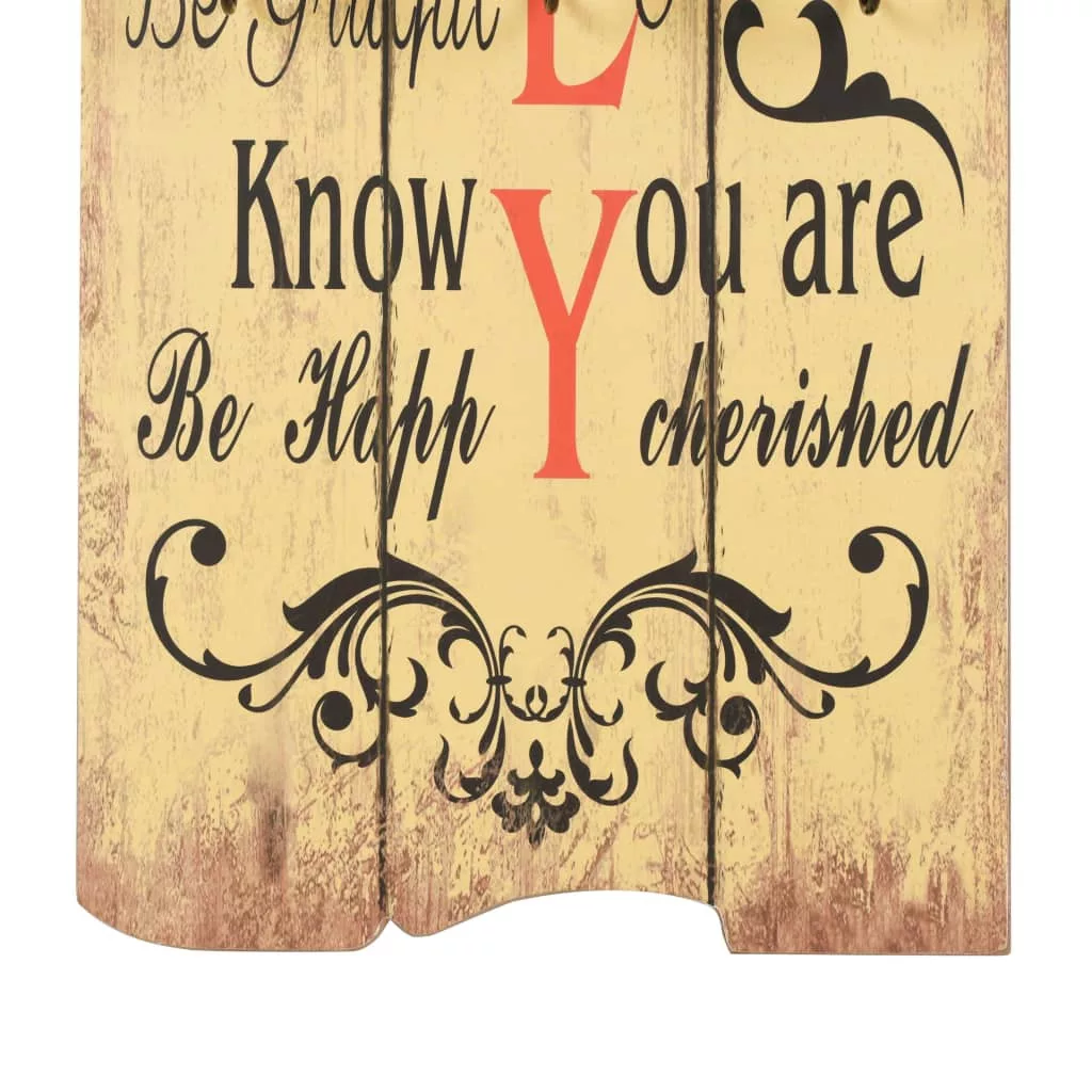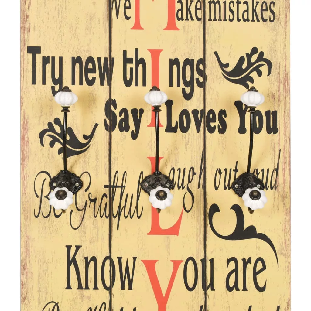 Vintage stílusú grafikája az alábbi feliratot ábrázolja: „Be thankful Always forgive Share Respect one another Show compassion We make mistakes Try new things Say I love you Be grateful Laugh out loud Know you are cherished Be happy”, így a 6 akasztóval ellátott ruhafogás rendkívül mutatós kiegészítője lesz otthonának, amire rögtön felkapják a fejüket a vendégek is. A fogas MDF-lapból készült, melynek köszönhetően rendkívül strapabíró. A három pompás fém akasztó két sorban van elrendezve, így a fogas bőséges helyet kínál kabátok, táskák, sálak, kalapok és egyéb kisebb kellékek számára. Két rögzítési ponttal rendelkezik, így könnyedén a falra szerelhető. Könnyen összeszerelhető. A szállítás tartalmazza a felszereléshez szükséges tartozékokat.