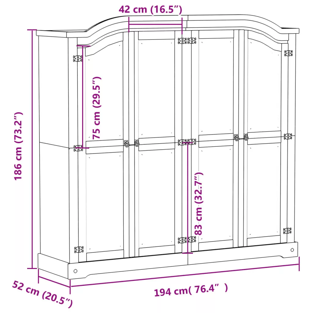 fehér Corona tömör fenyőfa ruhásszekrény 194 x 52 x 186 cm