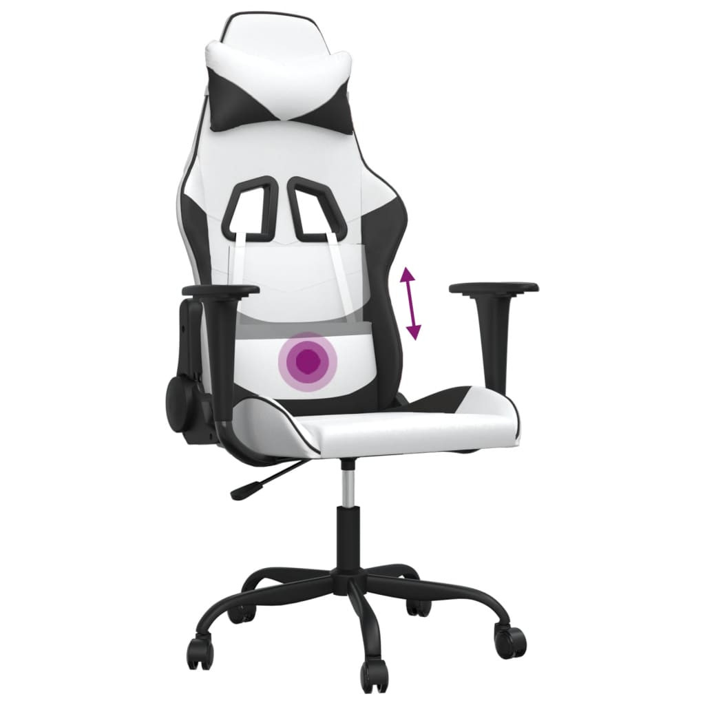 Üljön ezen az egyedülálló játékszéken és élvezze a kényelmes játékélményét! Tartós műbőr: A prémium minőségű műbőr rendkívül tartós anyag. Foltálló, így nedves ruhával könnyen tisztítható. A sima felület fényűző megjelenésű, és a valódi bőr szépségét biztosítja.Masszázs funkció: A derékpárnában található masszázspont hatékonyan enyhíti a fáradtságot, és ellazítja a munkahelyen.Állítható magasság: A kar segítségével tetszés szerint állíthatja az ülés magasságát.Kényelmes kialakítás: A 360 fokban forgatható kivitel széles mozgástartományt biztosít. Ezenkívül a görgőkkel kényelmesen mozgatható. Élvezze a maximális kényelmet az állítható háttámla legoptimálisabb pozíciójának és szögének beállításával.Masszív és stabil váz: A fémből és furnérlemezből készült vázak erős szerkezetet és stabilitást biztosítanak. Jó tudni:A termék USB-csatlakozóval rendelkezik, amelyhez hitelesített, 5 V-os USB áramforrás szükséges (nem alaptartozék). Ügyeljen a nyílt tűz és más erős hőforrások veszélyére a termék közelében. Maximum 110 kg ülésenként. Ez a termék DC 5V-ról működik, de a tanúsított 5V-os USB-tápforrást nem tartalmazza. A magasabb feszültség túlmelegedést okozhat, ami a készülék károsodását, valamint a túlmelegedés és a tűz esetleges kockázatát okozhatja.