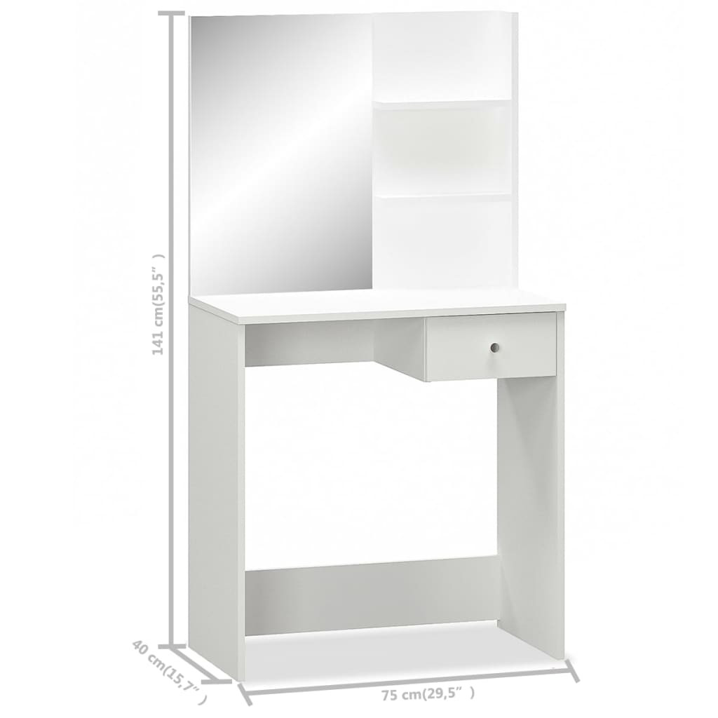 Ez a modern és stílusos dizájnú sminkasztal hálószoba berendezése nagyszerű kiegészítője lehet. Az öltözőasztal forgácslemezből PVC sarkokból készült, így stabil és strapabíró. Tágas fiókjának és polcrendszerének köszönhetően elegendő tárolóhely áll rendelkezésre benne az összes szépészeti terméke, illetve minden olyasmi számára, amit elérhető közelségben szeretne tudni és így csökkenthti a hálószobában felhalmozódó felfordulást. A csomaghoz tartozó szett segítségével könnyen összeszerelhető.