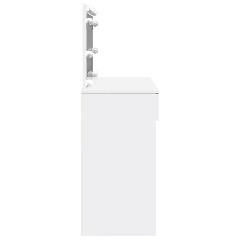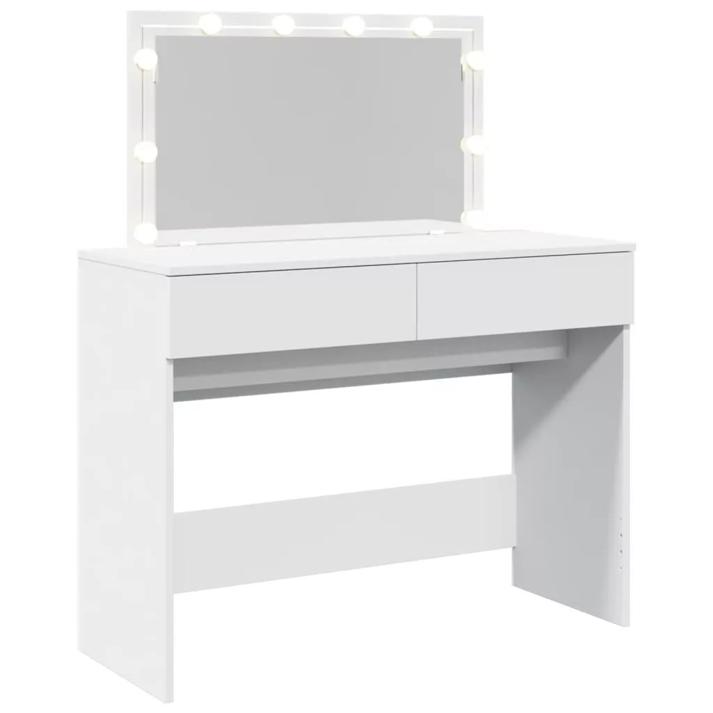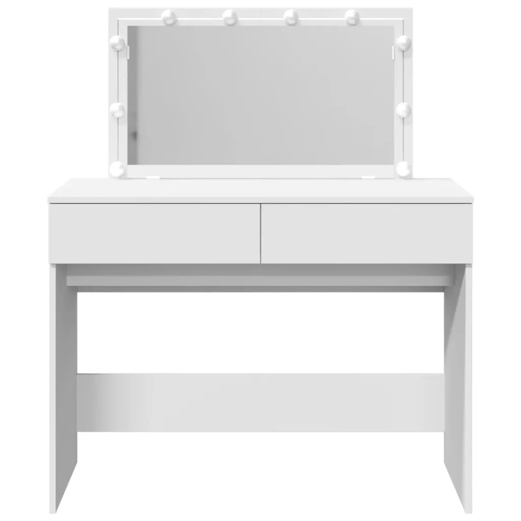 A fésülködőasztal hálószobája nagyszerű kiegészítője lesz, miközben kézközelben tarthatja kozmetikumait! Stabil és tartós anyag: A szerelt fa tartós és stabil anyag sima felülettel, amely ellenáll a nedvességnek, a vetemedésnek és a hasadásnak, így megbízható választás különféle projektekhez.Bőséges tárolóhely: A 2 fiókkal rendelkező fésülködőasztal bőséges helyet biztosít alapvető holmijai kézközelben történő rendezett tárolásához.Hasznos tükör: A gyönyörű tükör segít a sminkelésben, és elegánsabbá teszi a sminkasztalt.LED-világítás: A pipereasztal USB-s LED-izzókkal lett ellátva, amelyek egyszerűen átkapcsolhatók melegről hideg fehér fényre. A tükör körüli LED-izzók az Ön szépségét is megvilágítják. Figyelem:A felborulás elkerülése érdekében ezt a terméket a mellékelt fali rögzítőeszközzel kell használni.