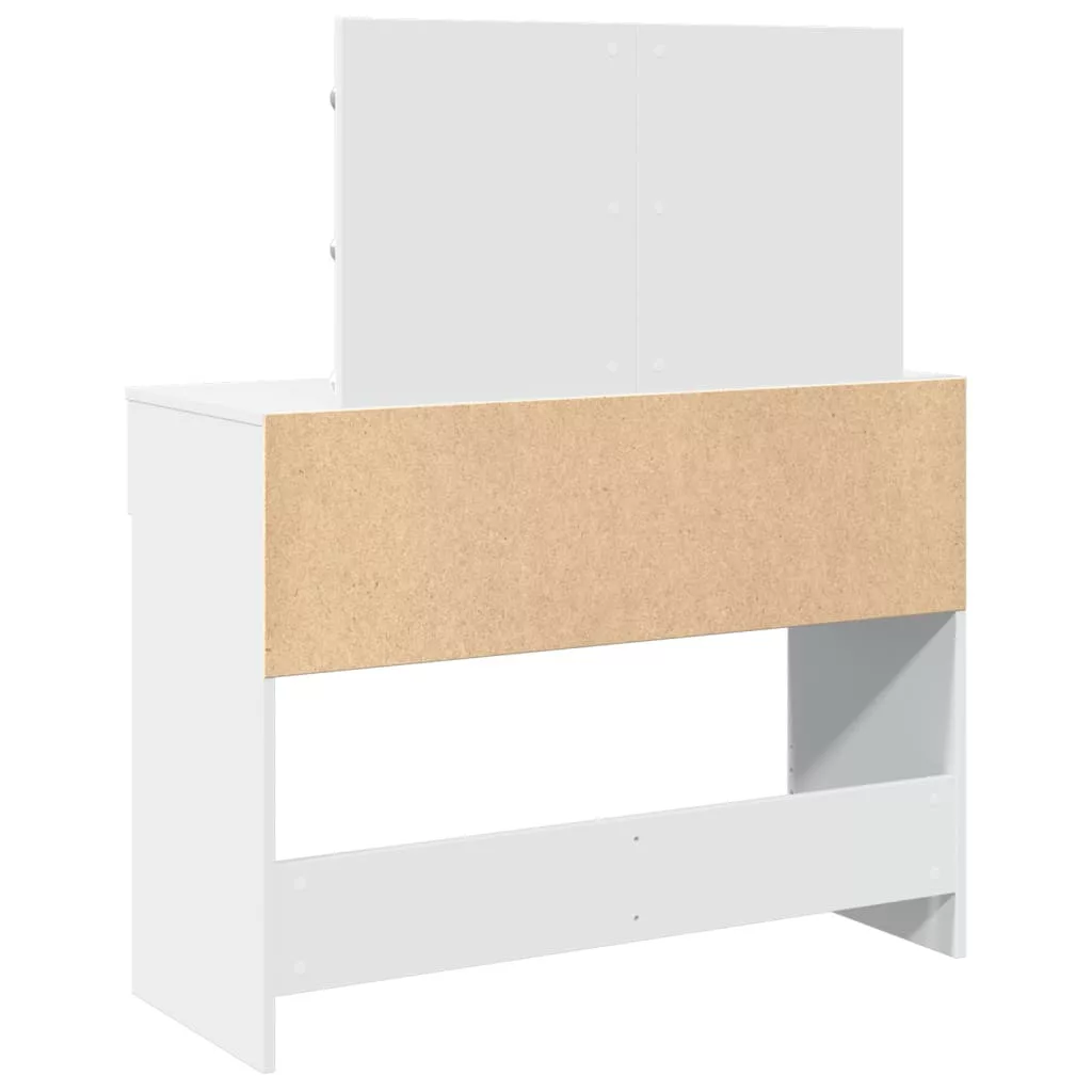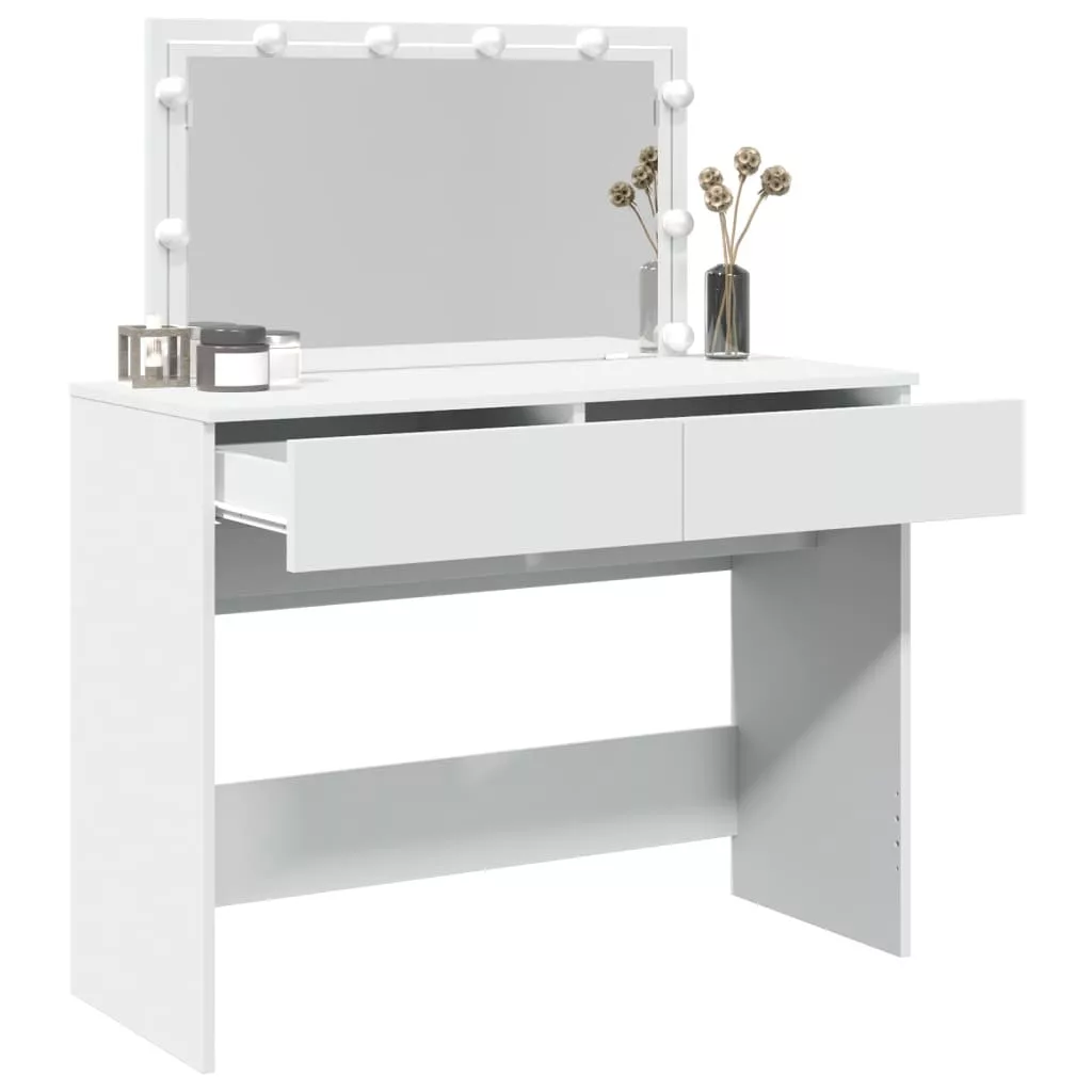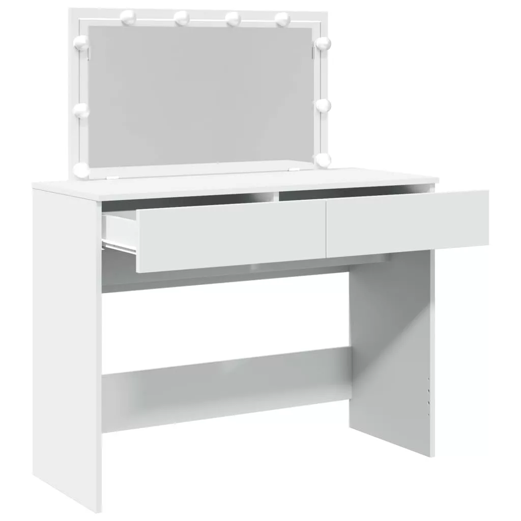 A fésülködőasztal hálószobája nagyszerű kiegészítője lesz, miközben kézközelben tarthatja kozmetikumait! Stabil és tartós anyag: A szerelt fa tartós és stabil anyag sima felülettel, amely ellenáll a nedvességnek, a vetemedésnek és a hasadásnak, így megbízható választás különféle projektekhez.Bőséges tárolóhely: A 2 fiókkal rendelkező fésülködőasztal bőséges helyet biztosít alapvető holmijai kézközelben történő rendezett tárolásához.Hasznos tükör: A gyönyörű tükör segít a sminkelésben, és elegánsabbá teszi a sminkasztalt.LED-világítás: A pipereasztal USB-s LED-izzókkal lett ellátva, amelyek egyszerűen átkapcsolhatók melegről hideg fehér fényre. A tükör körüli LED-izzók az Ön szépségét is megvilágítják. Figyelem:A felborulás elkerülése érdekében ezt a terméket a mellékelt fali rögzítőeszközzel kell használni.