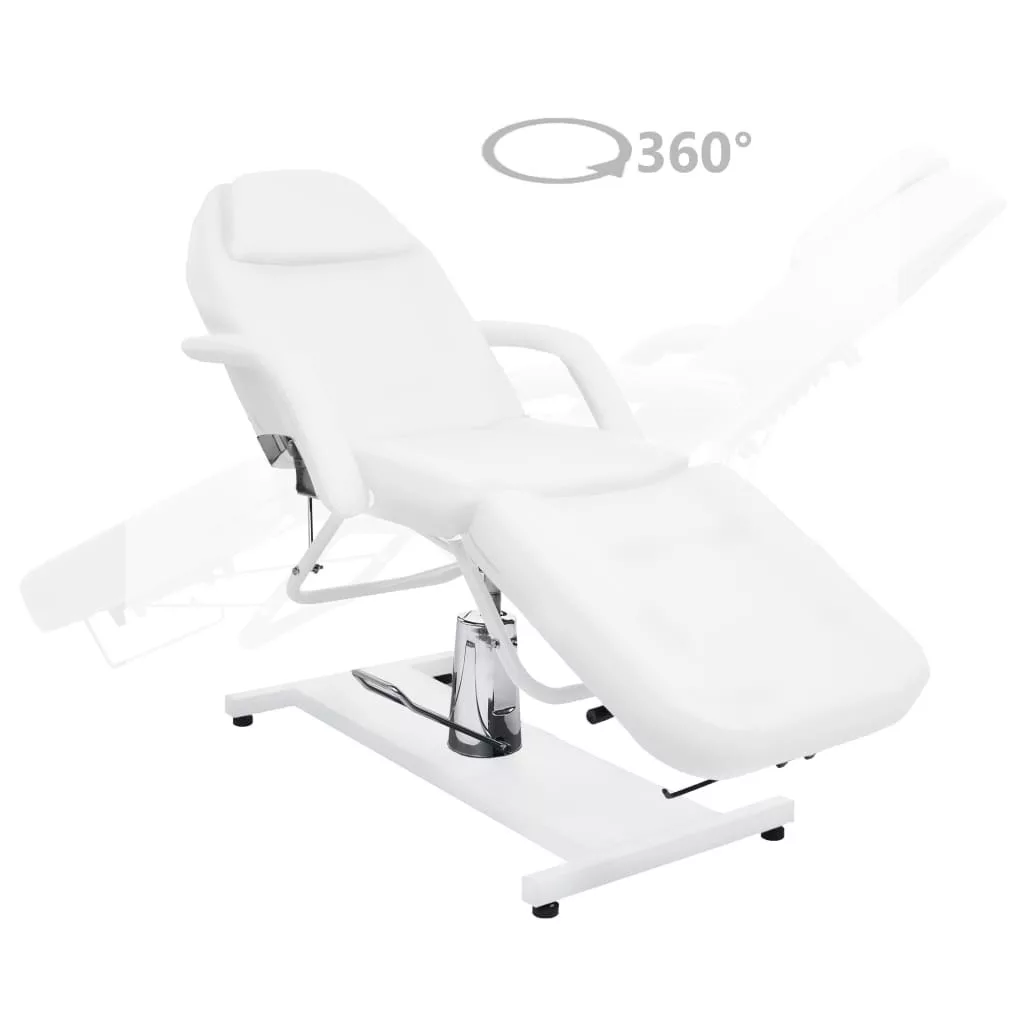 A masszázsasztal kozmetikai kezelések széles skálájához is használható. A kozmetikai ágy vastag hablábbal és kényelmes PVC-anyaggal borított ülő- és hátpárnákkal rendelkezik a hosszú élettartam érdekében. Könnyű kialakítása biztosítja az ágy kényelmét és teljes rugalmasságát. A vas talp nagy stabilitást biztosít az ágynak. Gázemelő mechanizmussal és kivehető kartámasszal, illetve állítható háttámlával és lábtartóval is rendelkezik. A kezelőasztal 360 fokban elforgatható. Ez a masszázsasztal valóban sokoldalú. Ideális arckezeléshez, bőrápoláshoz, masszázshoz, tetováláshoz vagy piercinghez. Maximum 110 kg ülésenként. Ügyeljen a nyílt tűz és más erős hőforrások veszélyére a termék közelében.