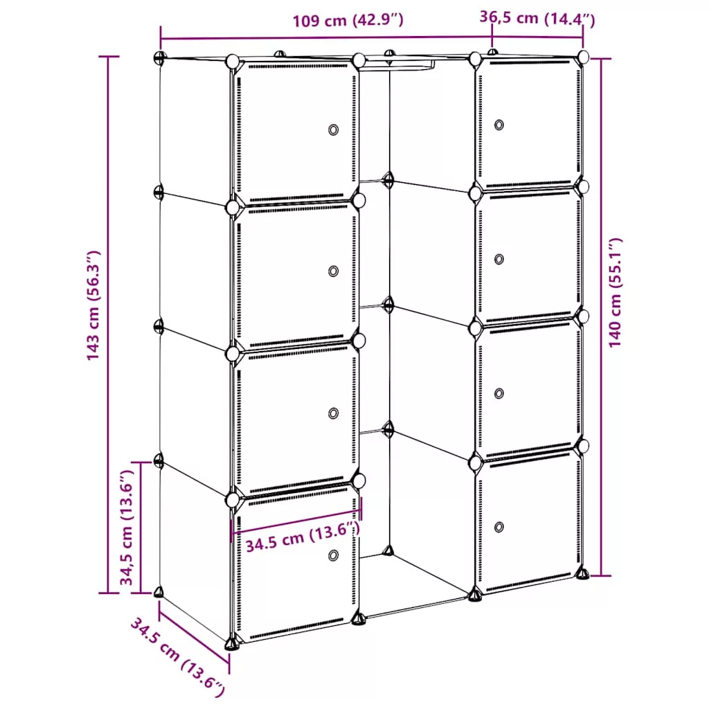 Ez a praktikus variálható szekrény nemcsak rendkívül stílusos, de lehetőséget ad rá, hogy szép rendezetten tárolja benne a ruháit és cipőit. Nagyszerű kiegészítője lehet a gyerekszobának, a nappalinak, az előszobának vagy a hálószobának. Ez a ruhásszekrény műanyag elemekből és krómozott acélhuzalból készült, így könnyen tisztítható. Okos dizájnjának köszönhetően könnyen és gyorsan felállítható különféle módokon, hogy illeszkedjék a térbe vagy épp a hangulatához. Kérjük, ne terhelje túl a polcokat és vegye figyelembe, hogy a műanyag gyúlékony.