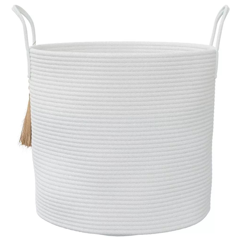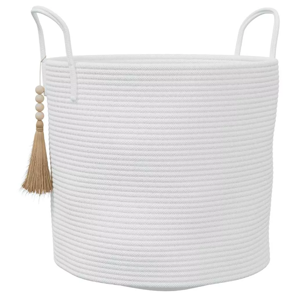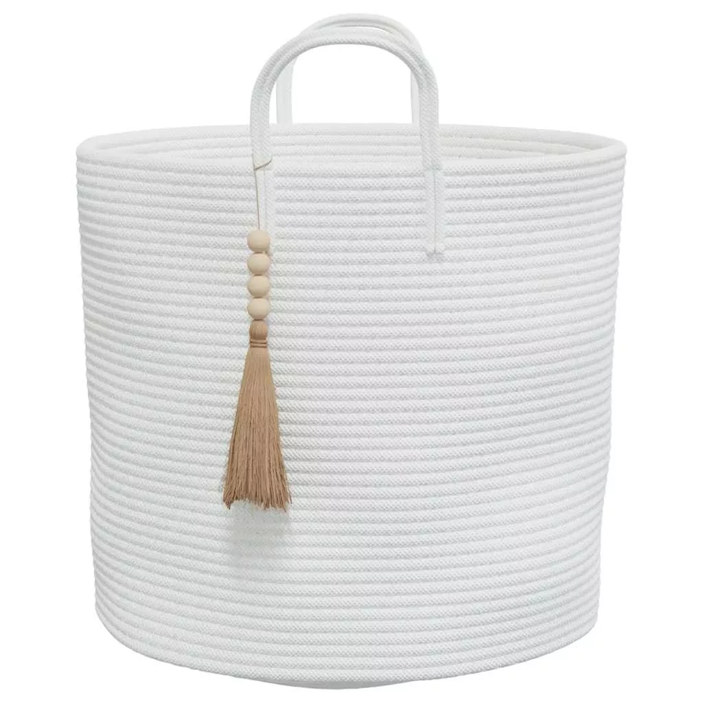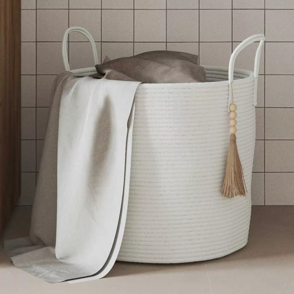 Ez a bojtos tárolókosár stílusos kialakításával mindenkit lenyűgöz, és nem csupán praktikus, de igazán szemet gyönyörködtető is lesz bármely helyiségben. Tartós anyag: A kosár szőtt pamutkötelekből készült, amely egy légáteresztő, puha és kivételesen tartós anyag.Helytakarékos kialakítás: Az összecsukható kialakításnak köszönhetően használaton kívül könnyen tárolható, így az összecsukható tárolókosár ideális kis lakóterekbe.Egyszerű szállítás: A két erős fogantyúval ellátott takarótároló kosár kényelmes fogást és egyszerű szállítást biztosít.Sokoldalú kosarak: A dekoratív tárolókosár sokoldalú. Használható ruhák, törölközők, takarók, gyerekjátékok vagy egyéb otthoni holmik tárolására, elősegítve, hogy a környezet tiszta és rendezett maradjon. Jó tudni:Javasoljuk, hogy a kosár átvételekor tömje ki például párnákkal, hogy helyreálljon az alakja, vagy szükség esetén használjon vasalót a forma kialakításához.A kosár élettartamának meghosszabbítása érdekében kerülje a gépi mosást, mert alakját vesztheti. Ehelyett inkább óvatosan mossa ki kézzel a kosarat, ha szükséges.
