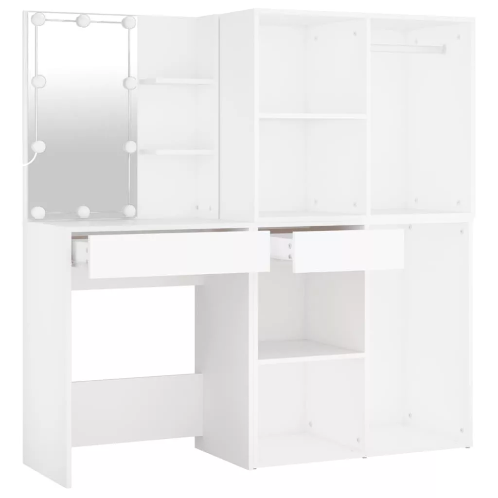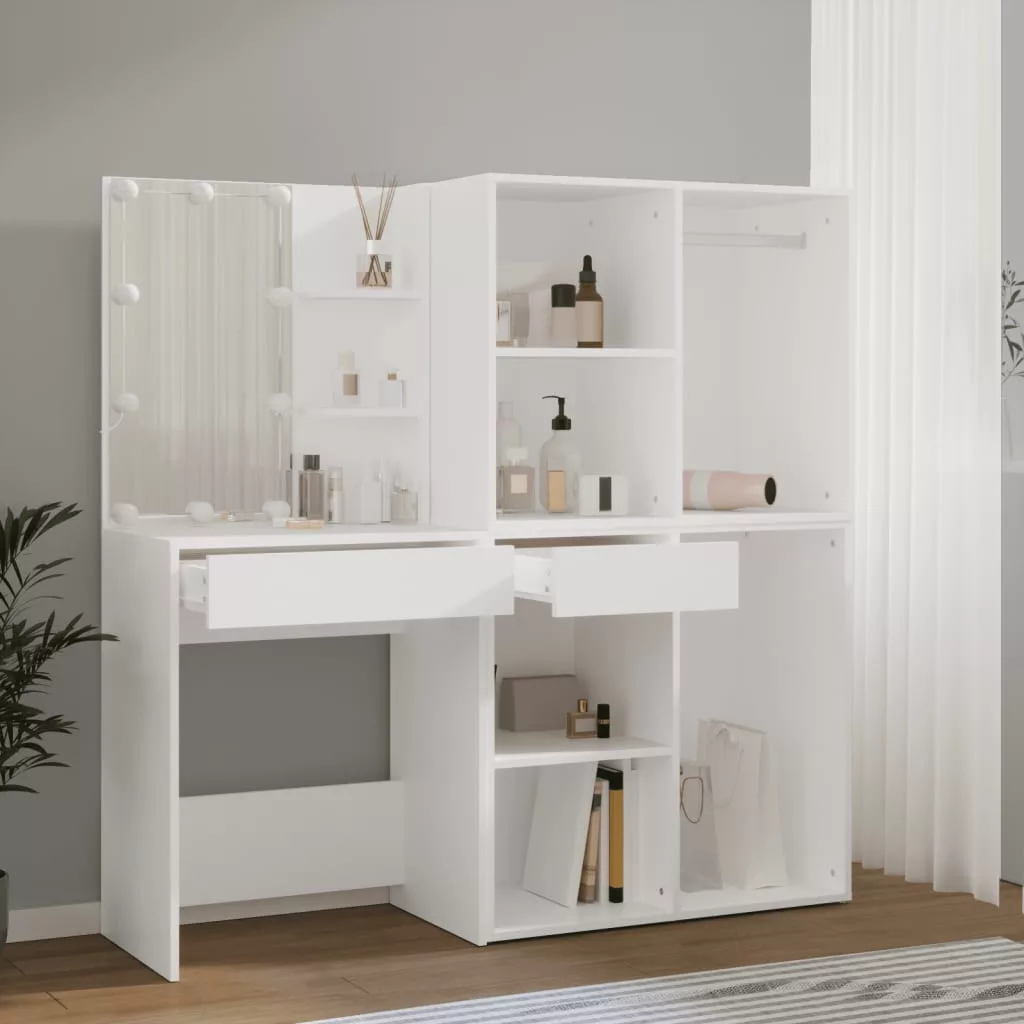 fehér szerelt fa fésülködőasztal LED-ekkel és 2 szekrénnyel