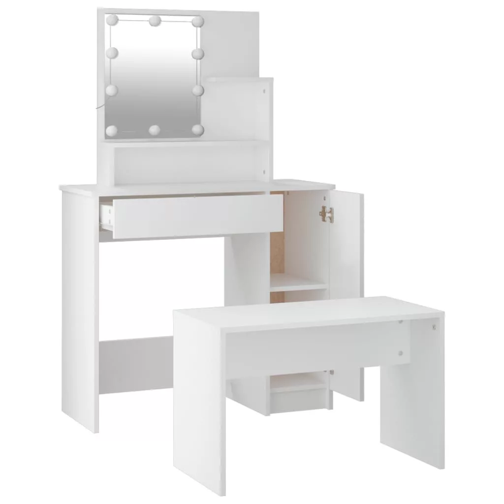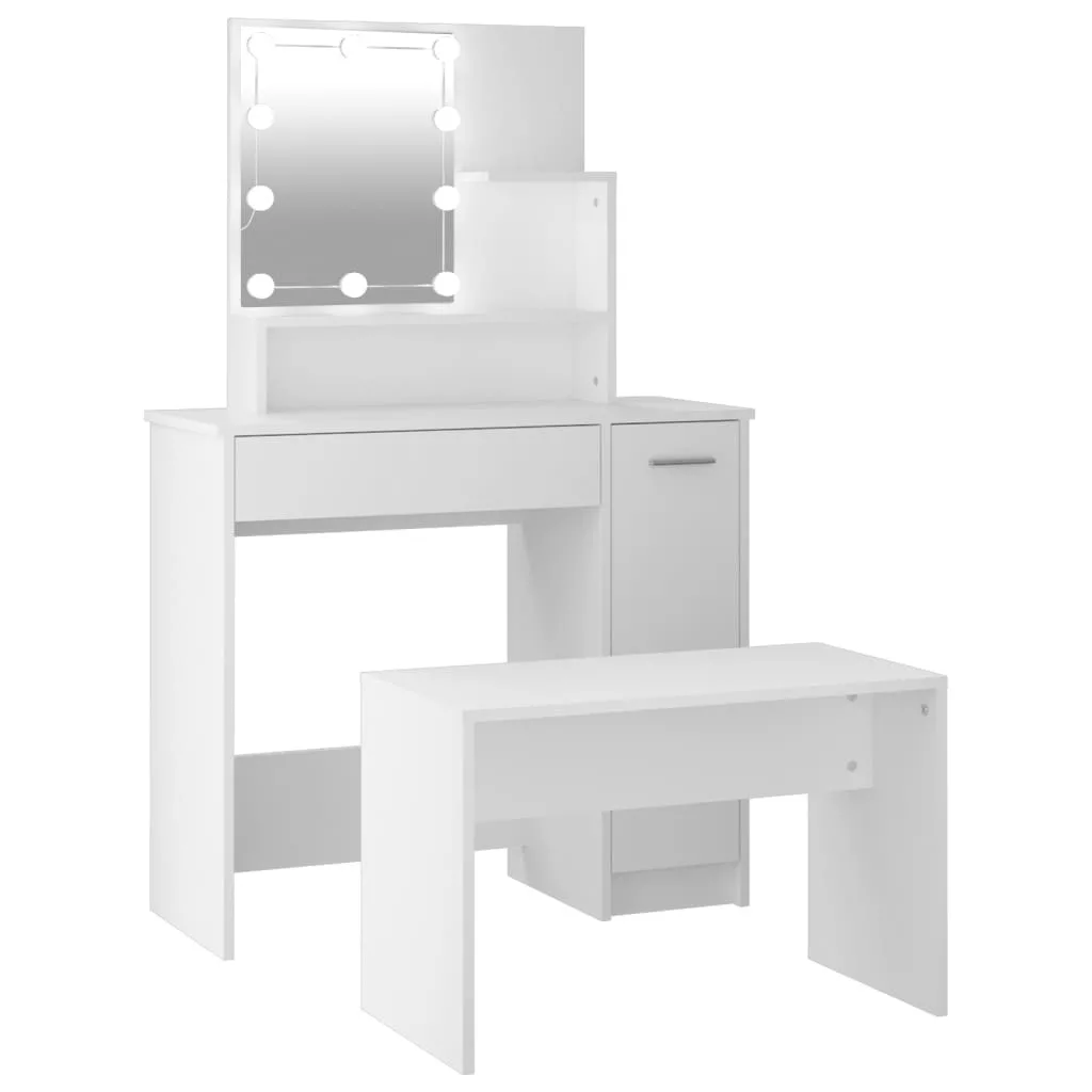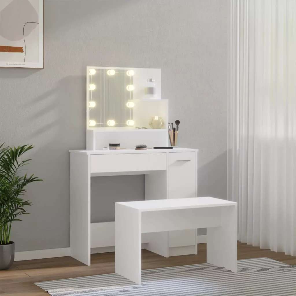 fehér szerelt fa fésülködőasztal-szett LED-ekkel