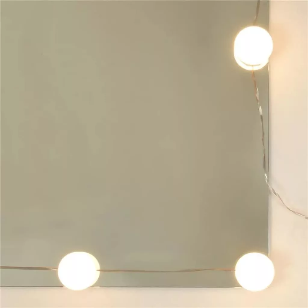 Ez a divatos fésülködőasztal-szett időtlen, kifinomult stílust visz hálószobájába. A LED-es fésülködőasztal-szett hálószobája tökéletes kiegészítője lesz, miközben kézközelben tarthatja kozmetikumait! Stabil anyag: A szerelt fa kivételes minőségű, sima felületű, szilárd, stabil és ellenáll a nedvességnek.Hasznos tükör: A tükrös fésülködőasztal tökéletes a napi szépségápolási rutinhoz. A tükör segít az arcápolásban és a sminkelésben.Bőséges tárolóhely: A székkel ellátott fésülködőasztal bőséges helyet biztosít sminkjei, ékszerei és a legfontosabb mindennapi holmijai számára.LED-világítás: A fésülködőasztal USB-s LED-izzókkal van ellátva, amelyek egyszerűen átkapcsolhatók melegről hideg fehér fényre. A tükör körüli LED-izzók az Ön szépségét is megvilágítják.Széleskörű felhasználás: Ez a fésülködőasztal-szett különféle helyszíneken használható, például a hálószobában, a gardróbszobában és bárhol máshol is. Figyelem:A dőlés megakadályozása érdekében a terméket a mellékelt tartóelem segítségével rögzíteni kell a falhoz. Megjegyzés:Az egyszerű összeszerelés érdekében minden termékhez mellékelünk összeszerelési útmutatót. Maximálisan 110 kg ülésenként. Ne használja ezt az elemet, ha bármelyik alkatrész törött, szakadt vagy hiányzik. Ez a termék DC 5V-ról működik, de a tanúsított 5V USB tápegység nem tartozik hozzá. Magasabb feszültség túlmelegedést okozhat, ami a készülék sérüléséhez és a túlmelegedés, valamint a tűz kockázatához vezethet.