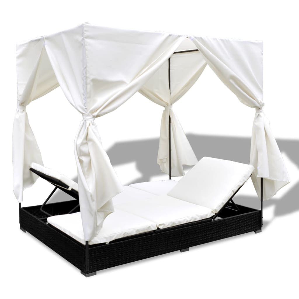 fekete polyrattan napozóágy függönyökkel