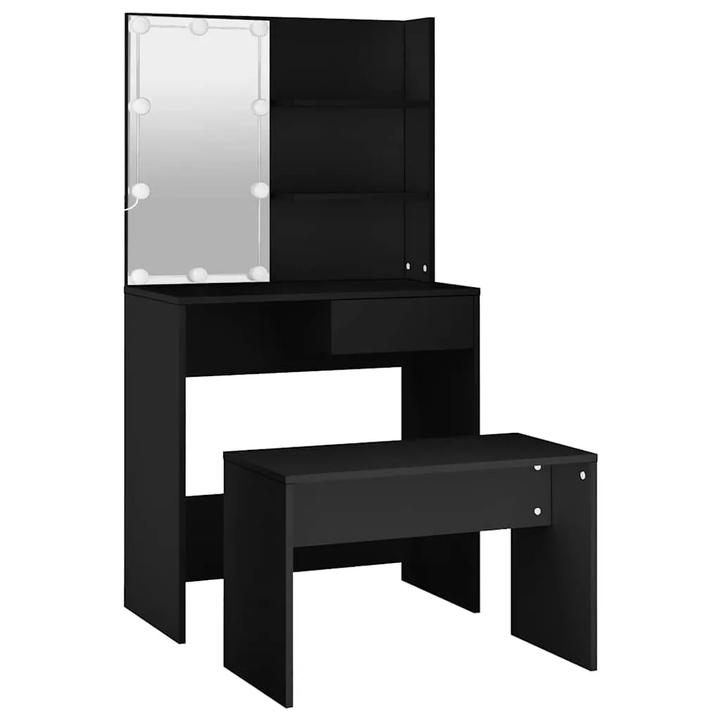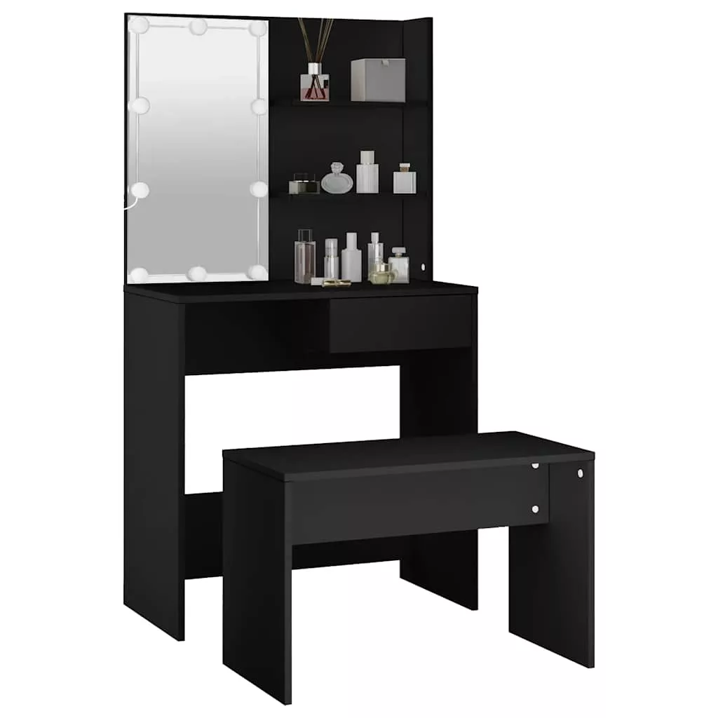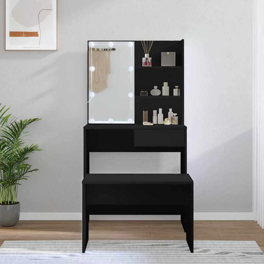 Ez a divatos fésülködőasztal-szett időtlen, kifinomult stílust visz hálószobájába. A LED-es fésülködőasztal-szett hálószobája tökéletes kiegészítője lesz, miközben kézközelben tarthatja kozmetikumait! Stabil anyag: A szerelt fa kivételes minőségű, sima felületű, szilárd, stabil és ellenáll a nedvességnek.Hasznos tükör: A tükrös fésülködőasztal tökéletes a napi szépségápolási rutinhoz. A tükör segít az arcápolásban és a sminkelésben.Bőséges tárolóhely: A székkel ellátott fésülködőasztal bőséges helyet biztosít sminkjei, ékszerei és a legfontosabb mindennapi holmijai számára.LED-világítás: A fésülködőasztal USB-s LED-izzókkal van ellátva, amelyek egyszerűen átkapcsolhatók melegről hideg fehér fényre. A tükör körüli LED-izzók az Ön szépségét is megvilágítják.Széleskörű felhasználás: Ez a fésülködőasztal-szett különféle helyszíneken használható, például a hálószobában, a gardróbszobában és bárhol máshol is. Figyelem:A felborulás elkerülése érdekében ezt a terméket a mellékelt fali rögzítőeszközzel kell használni. Maximálisan 110 kg ülésenként. Ne használja ezt az elemet, ha bármelyik alkatrész törött, szakadt vagy hiányzik. Ez a termék DC 5V-ról működik, de a tanúsított 5V USB tápegység nem tartozik hozzá. Magasabb feszültség túlmelegedést okozhat, ami a készülék sérüléséhez és a túlmelegedés, valamint a tűz kockázatához vezethet. GPSR