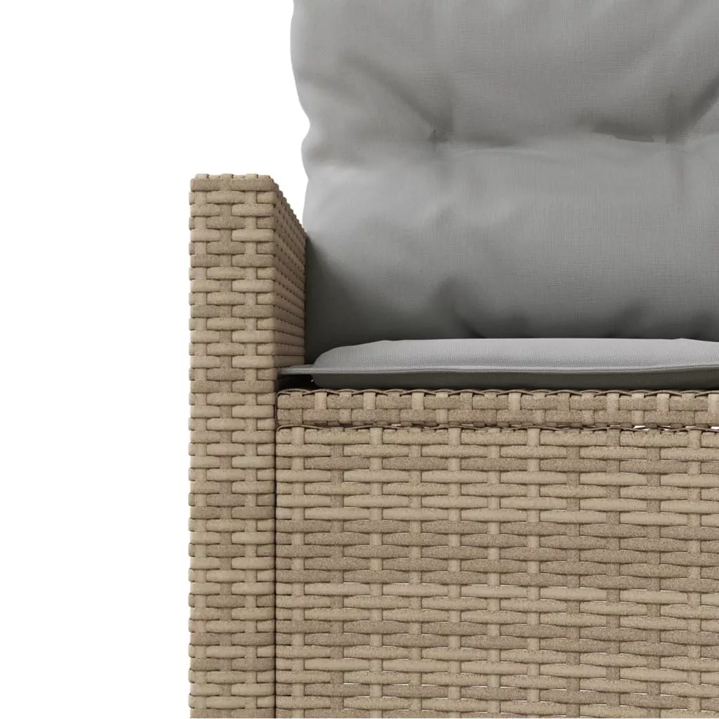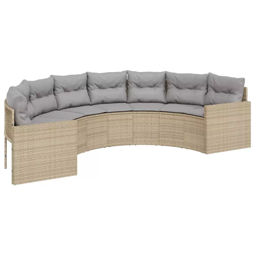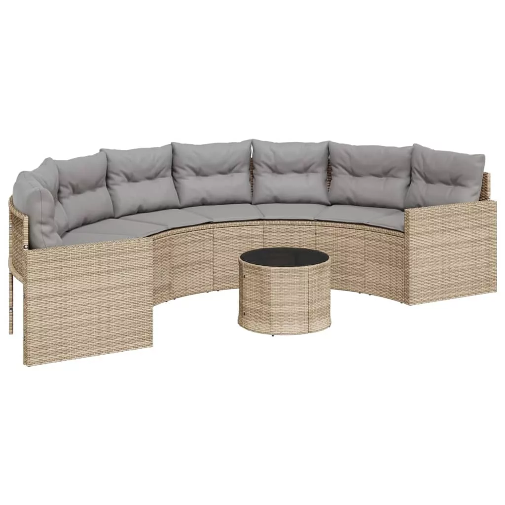 félkör alakú bézs polirattan kerti kanapé asztallal és párnával