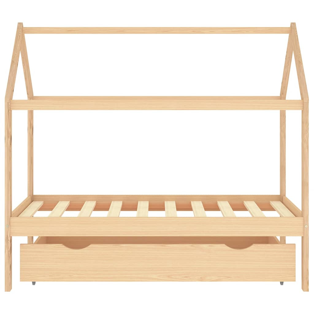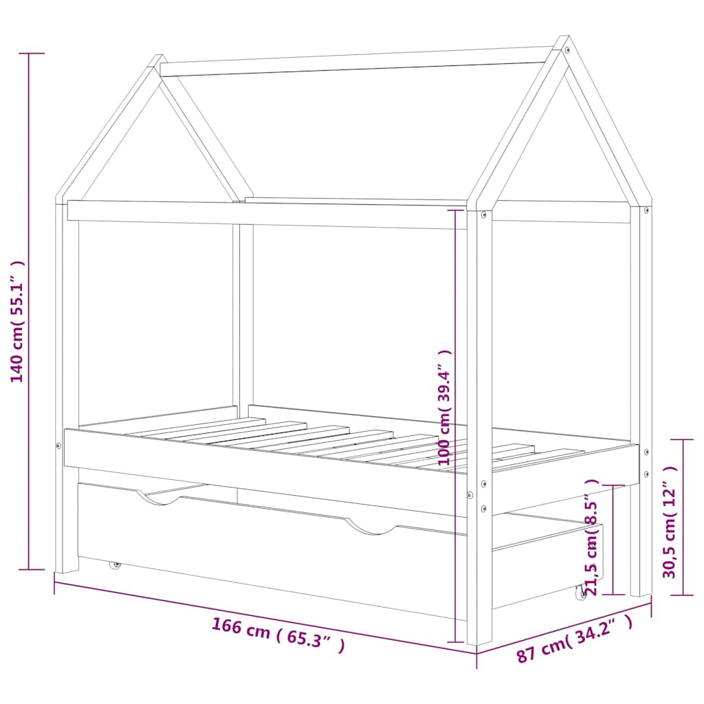 Ez a fiókos fa gyerekágykeret praktikus és dekoratív kiegészítője lesz bármely hálószobának. Az ágy okosan megtervezett faház stílusú kerettel rendelkezik, amelyre ágyfüggönyöket akaszthat, hogy magán szférát biztosítson gyermekének. Olvasósarokként vagy játszóházként is használhatja gyermeke. Ez a tömör fenyőfából készült ágykeret rendkívül masszív és tartós. A masszív lécek biztosítják a szükséges támaszt és kényelmet. A beépített 2 fogantyús ágyfiók bőséges tárolóhelyet biztosít az összehajtogatott ruhák, játékok stb. tárolására, tisztán és rendben tartva a szobát. A könnyen gördülő kerekek szőnyeg- és fapadlón is kiválóan működnek. Ez az ágykeret 80 x 160 cm-es matrachoz alkalmas. Felhívjuk figyelmét, hogy a szállítmány csak ágykeretet tartalmaz, matracot és függönyt nem. Az ágy könnyen összeszerelhető. A hozzá illő matracokat megtekintheti áruházunkban. Figyelmeztetés 4 éves kor alatti gyermekek számára nem alkalmas. FIGYELEM. Ne helyezze a gyermekágyat hőforrások, ablakok és egyéb bútorok közelébe. FIGYELEM. Ne használja ezt a gyermekágyat, ha valamelyik része eltört, elszakadt vagy hiányzik.