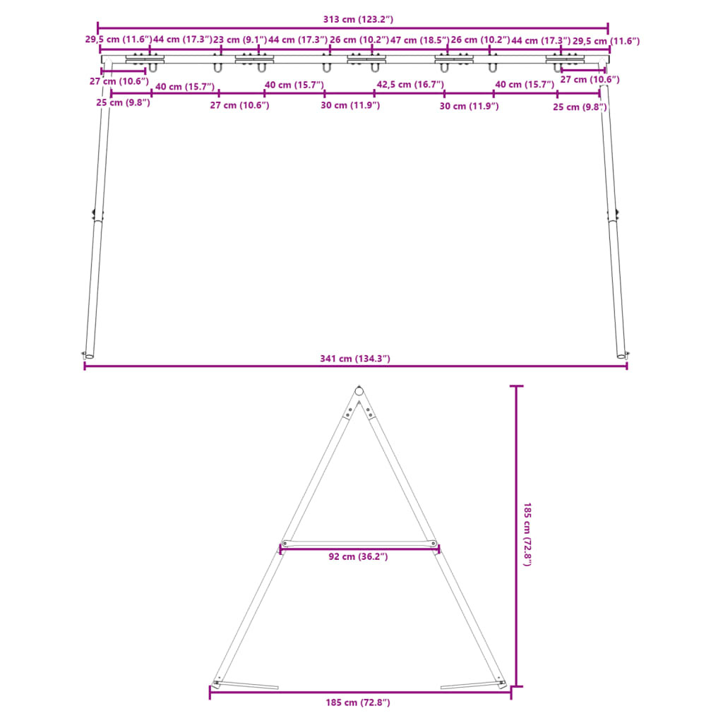 Varázsolja kertjét gyerekei játszóterévé ezzel a hintavázzal! Nagy teherbírású fém anyag: Ez a hintaváz festett acélcsövekből készült, amelyek rozsdaállók, rendkívül erősek, és ellenállnak a deformációnak, kiváló stabilitást és tartósságot biztosítva. Szilárd és stabil szerkezet: Ez a hintaváz A-alakú vázzal rendelkezik, amely erős támaszt biztosít, és nem billen fel. A megerősített csavarozás jelentősen megerősíti a teljes szerkezetet. Emellett négy további cövek növeli a stabilitást és a biztonságot. A legtöbb hintához alkalmas: Ez a sokoldalú hintaállvány különféle hintákkal használható, például hintaüléssel, csészealjhintával, hálós ülőhintával, övhintával, trapézhintával, hintatárcsával, függő kagylószékkel stb. 2 felszerelési lehetőség: Ez a hintaváz két lehetőséget kínál a hinták felszerelésére: vagy négy egyszemélyes hinta szerelhető fel, vagy egy csészealjhinta és két egyszemélyes hinta. Széleskörű felhasználás: Ez a hintaváz különféle helyeken helyezhető el, például kertben, hátsó udvaron, óvodában, játszótéren stb. Jó tudni: A szállítás a hintavázat tartalmazza, a hintaülések külön vásárolhatók meg. Látogasson el a webáruházba, hogy megtalálja a hozzáillő hintavázat a hintakészlet kiegészítéséhez! Figyelem. 3 év alatti gyermekek számára nem alkalmas. Csak háztartási használatra.