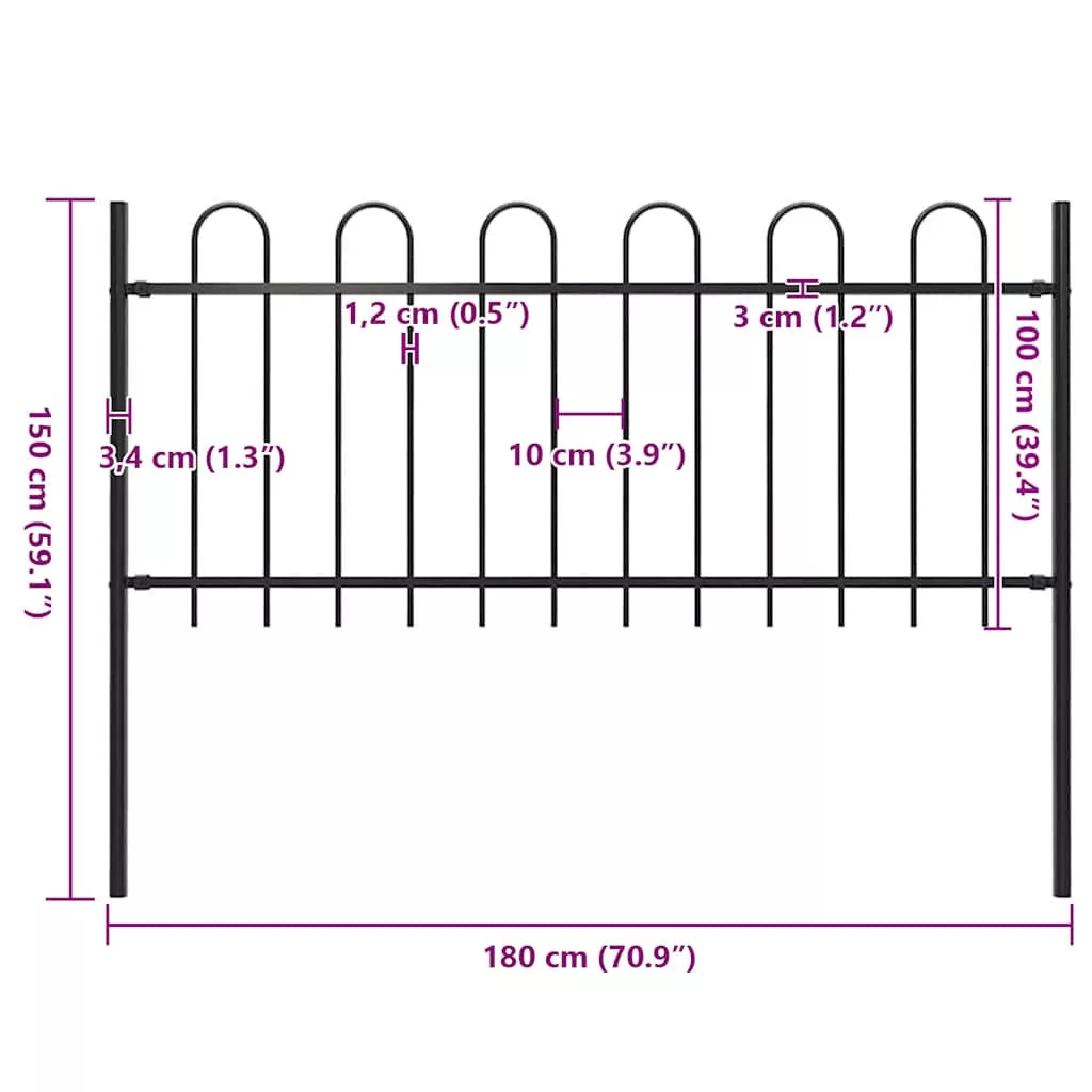 Határolja el kertjét, otthonát vagy sétálóösvényét ezzel az elegáns kerti kerítéssel! Ez a kiváló minőségű, hajlított tetejű, acél kerti kerítés összesen 1,8 méter hosszú, és kertjét, otthonát vagy kereskedelmi ingatlanát biztonságosan körülveszi. A függőleges elemek teteje hajlított, a vízszintes elemek viszont merevítésként szolgálnak a váz megerősítéséhez, így ez a kerítés magas fokú biztonságot nyújt. Nagy teherbírású, porszórt bevonatú acélból készült, így ez a kültéri kerítés erős és stabil, masszív és strapabíró. A mellékelt szerelési anyagokkal a kerti kerítés könnyen összeszerelhető. Megjegyzés: Több elemet is vehet, így a kerítés igény szerint meghosszabbítható.