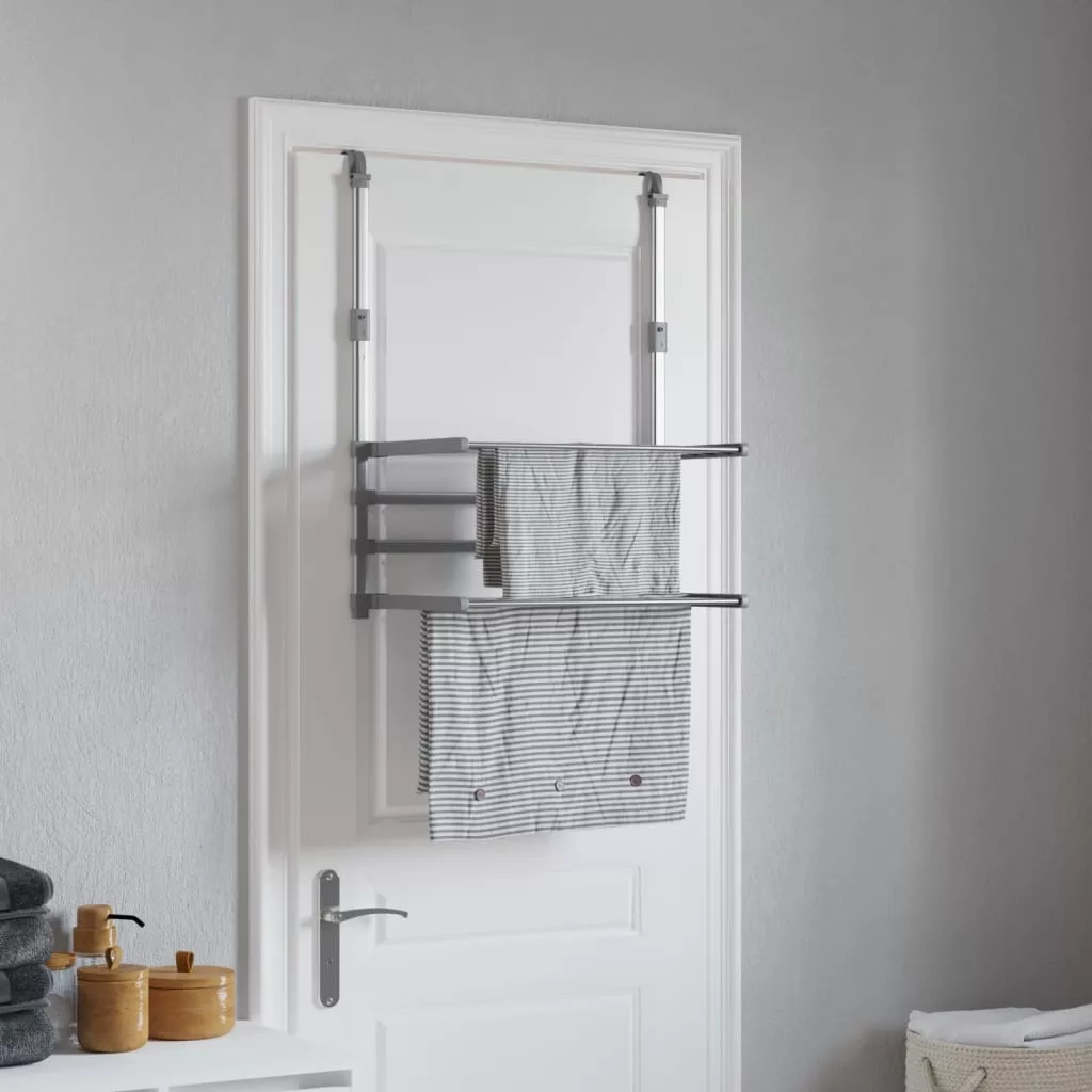 Ha korlátozott hely áll rendelkezésre az erkélyen, ez a praktikus szárítóállvány nagyszerű megoldás. Erős anyag: Az alumínium fém könnyű és erős. Önvédő oxidréteggel ellenáll a korróziónak. A törülközőtartó alumínium váza szilárdságot és stabilitást biztosít.Rugalmas kialakítás: A ruhaszárító állvány visszahúzható kialakítása lehetővé teszi a vízszintes rúd akasztási helyzetének igény szerinti rugalmas beállítását, így tökéletesen alkalmazkodik a ruha tárolásához vagy szárításához.Összecsukható funkció: A ruhatartó szintjei külön-külön összecsukhatók, így a hosszabb ruhaneműk könnyen száríthatók. Használaton kívül mindkét szint lehajtható a helytakarékosság érdekében.Széleskörű felhasználás: Az ajtófogas a legtöbb ajtóhoz vagy más helyhez illeszkedik. Használhatja az ajtó feletti ruhaszárítót a mosókonyhában, az erkélyen, a fürdőszobában vagy akár a radiátor felett.