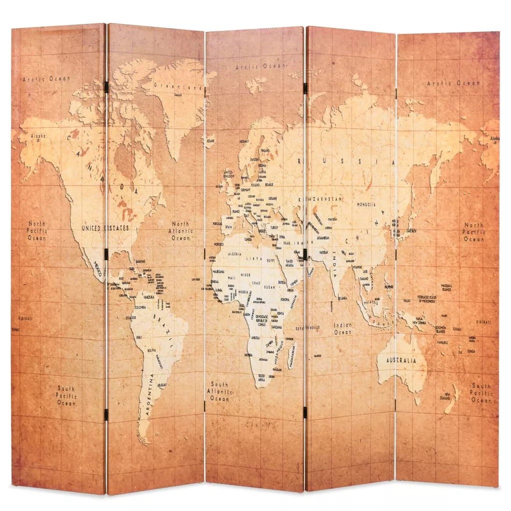 A paraván szélessége 200 cm, magassága 170 cm. Ideális arra, hogy létrehozza privát szféráját, de akár térelválasztó elemként is használható. Rendkívül praktikus és mutatós kiegészítője lesz hálószobájának, nappalijának vagy irodájának. A paraván tömör favázzal rendelkezik, melyet mindkét oldalán világtérképpel díszített vászon fed, így az modern bájjal ruházza fel otthonát. A paraván könnyen összecsukható, tehát rendkívül helytakarékos, ha épp nem használja.
