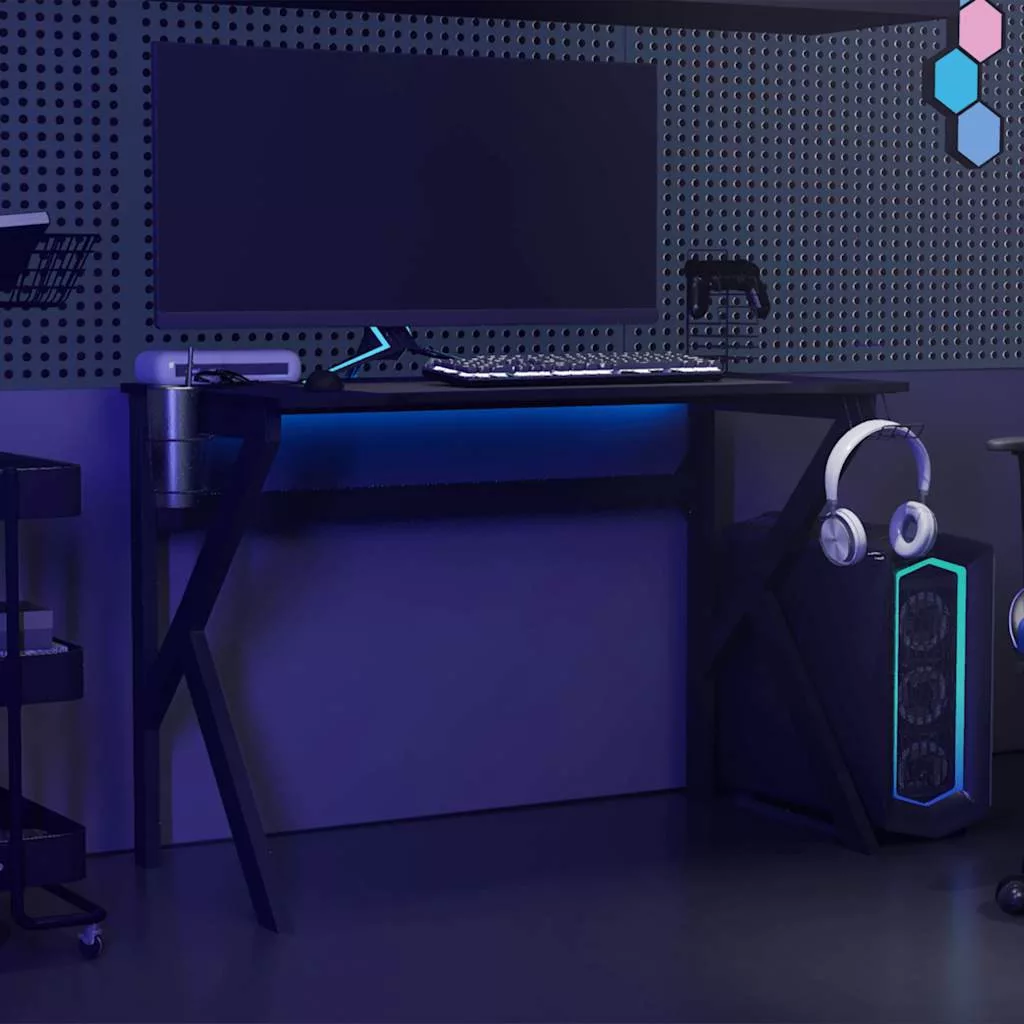 Ez a gamer asztal garantálja a koncentrációt és a kényelmet játék vagy munka közben. Az áramvonalas, ergonomikus kialakítás tökéletes testtartást biztosít játék során, így hosszabb ideig és jobban játszhat! Ez a számítógépasztal tartalmaz egy fülhallgató- és egy kontrollertartót, amelyen a fülhallgató kézközelben tartható. Pohártartóval is rendelkezik az italok tárolására. Elegendő helyet biztosít a monitorok, számítógépek, billentyűzetek és egyéb játékkellékek számára. Emellett a vas K-alakú láb kialakítása stabillá teszi és bármilyen komoly játékos igényeinek megfelel.