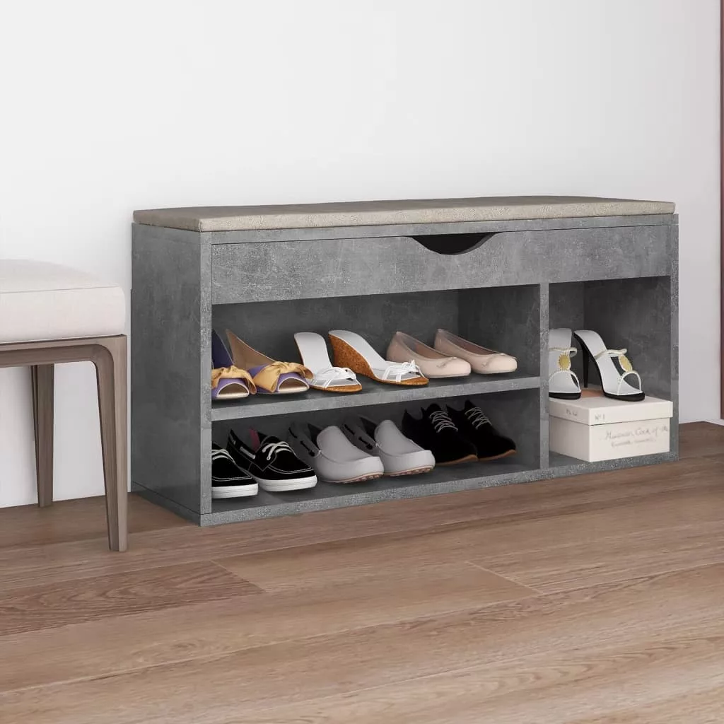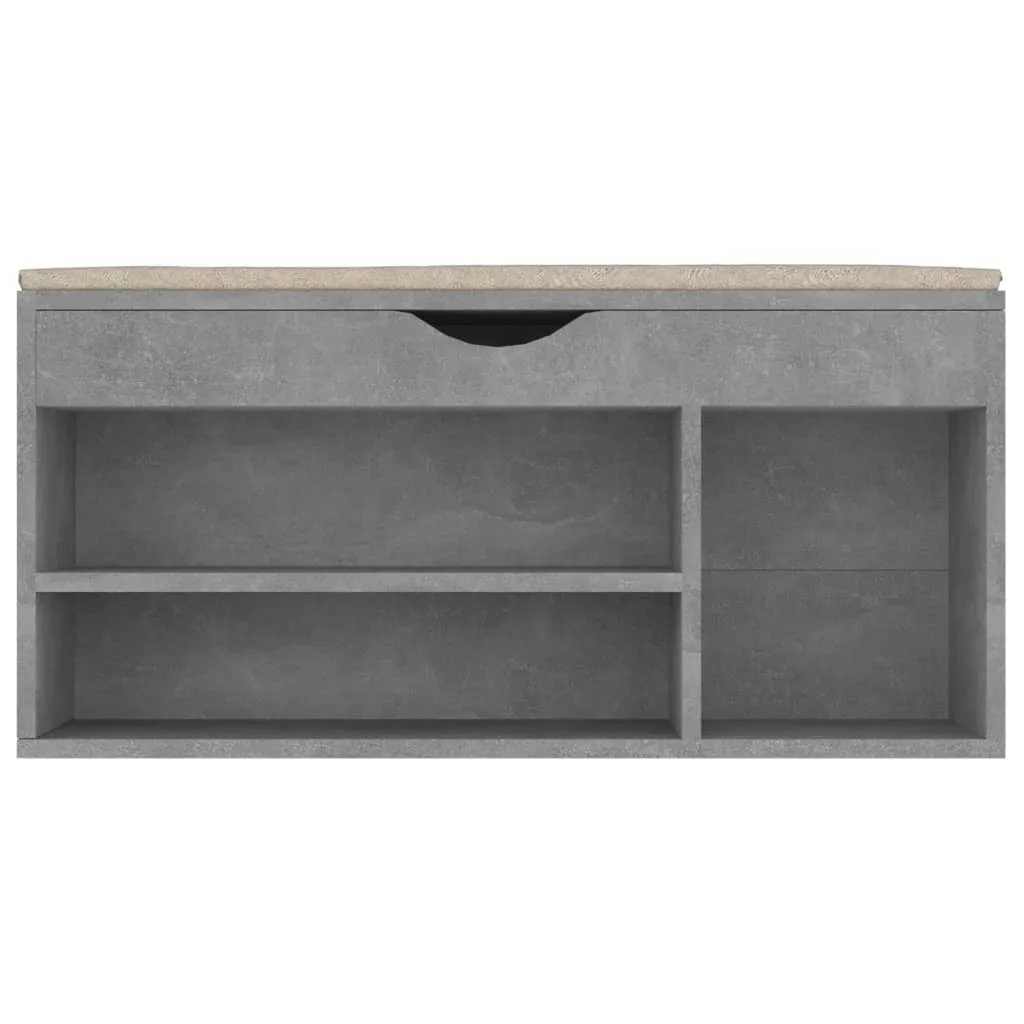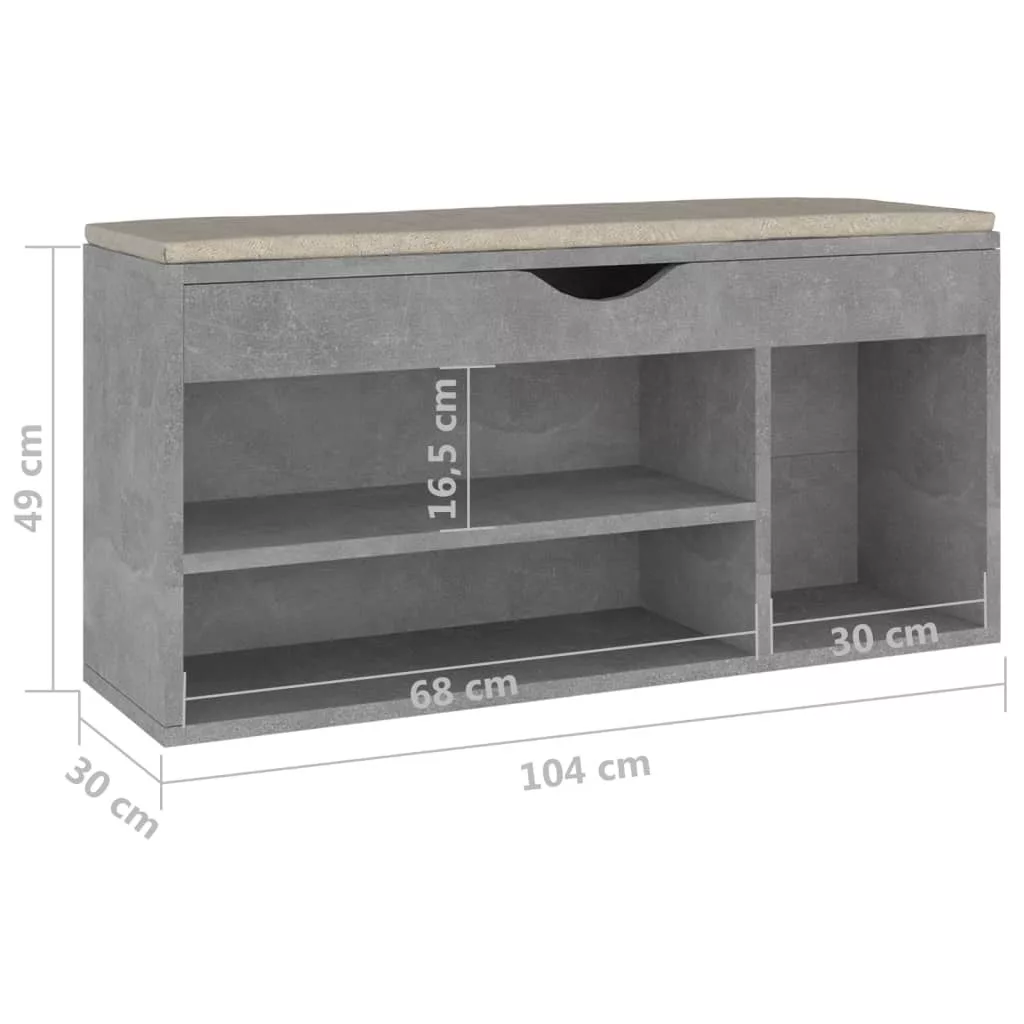 betonszürke szerelt fa cipőtároló pad párnával 104 x 30 x 49 cm