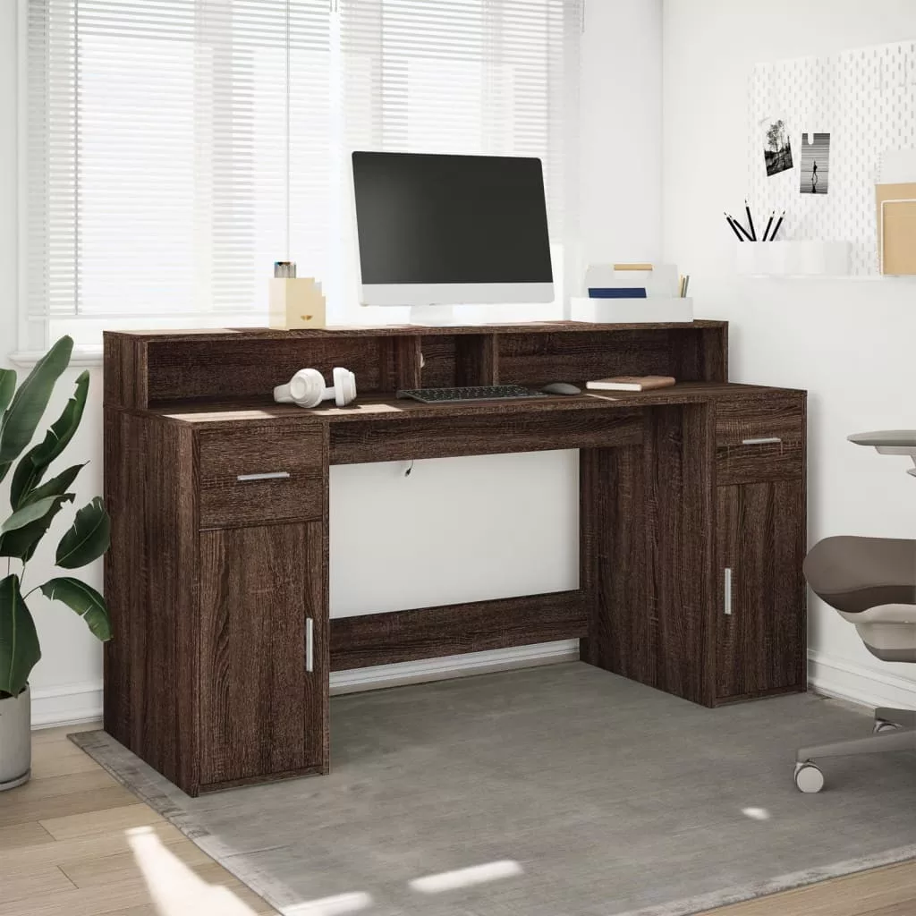 barna tölgy színű szerelt fa íróasztal LED-ekkel 160x55x91 cm