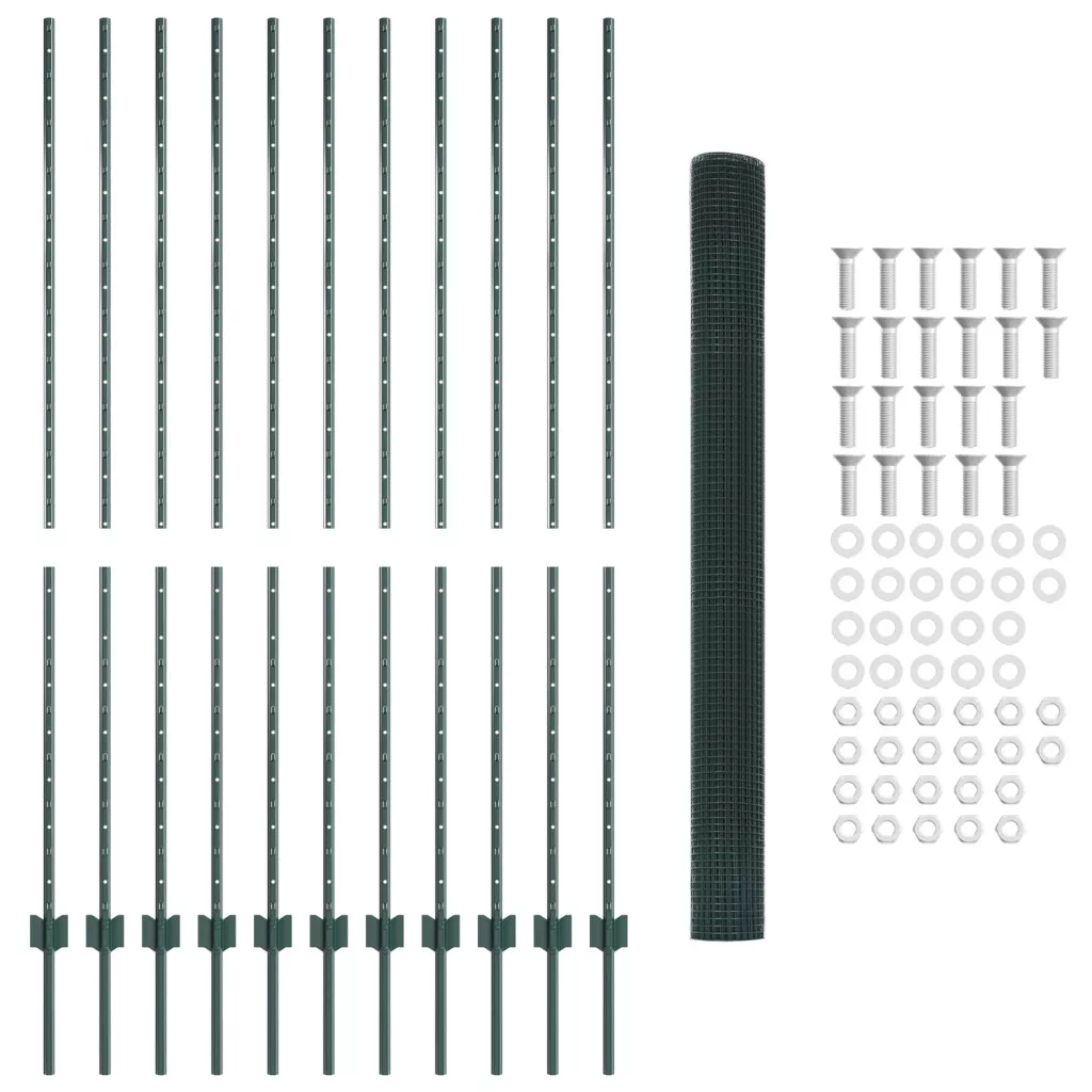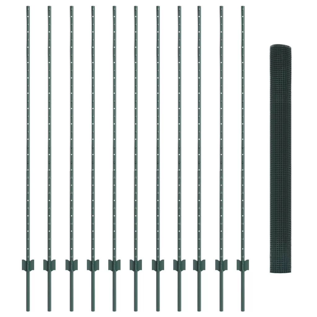 Ez a vidaXL Hegesztett Háló Kerítés 11 U Oszloppal tökéletes a kültéri terek feldobására. Erős és nagyon rugalmas, jól használható bármilyen kertben vagy kültéri helyen. A sima zöld felület nemcsak jól néz ki, de jó védelmet is nyújt a kis állatoknak, széppé téve a kerted. Ötletes Építkezés: PVC bevonatú acél; arra lett kitalálva, hogy bírja a különféle időjárást. UV Ellenálló: A napfénynek is ellenáll, megőrzi a ragyogó zöld színt. Többféle Felhasználás: Ideális állatkerítésekhez és hatékony kertkerítésekhez, jól jön mindenféle kültéri munkához. Könnyű Összeszerelés: Alap szerszámokkal, mint kalapács, mérőszalag és olló. Teljes Készlet: Minden csomag tartalmaz egy tekercs csirkehálót és tizenkét masszív oszlopot a teljes kerítési beállításhoz, ideális nagy kertekhez.