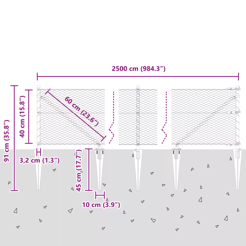 Ez a vidaXL Hexagon Kerítés biztonságos határt ad a kültéri helyeknek. Modern szürke színe és szilárd felépítése tökéletesen passzol bármilyen kerthez, miközben biztonságot és tartósságot is nyújt—tökéletes különböző kültéri felhasználásra. Tartós anyag: Ez a kerítés fém és műanyag keveréke, ami jól bírja az időjárást, és szuper kültéri helyekhez. Tökéletes kültéri használatra: A stílusos matt szürke befejezés tök jól megy a modern terekhez, miközben szilárd határt ad a kertednek. Könnyű összeszerelés: A csomag a kényelmet szolgálja—csak két ember, egy kalapács, és máris kész! Átfogó készlet: Minden, amire szükséged van, benne van: kerítésoszlopok, háló, cövek rögzítők, kábelkötők és összekötők az egyszerű telepítéshez. Sokféle méret: Ez a kerítés különböző helyekhez jó, így könnyen alkalmazkodhatsz más kertekkel meg formákkal.