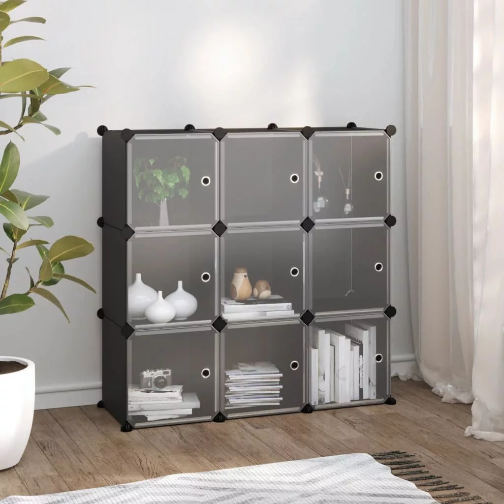 fekete polipropilén tárolókocka 9 db kockával és ajtókkal