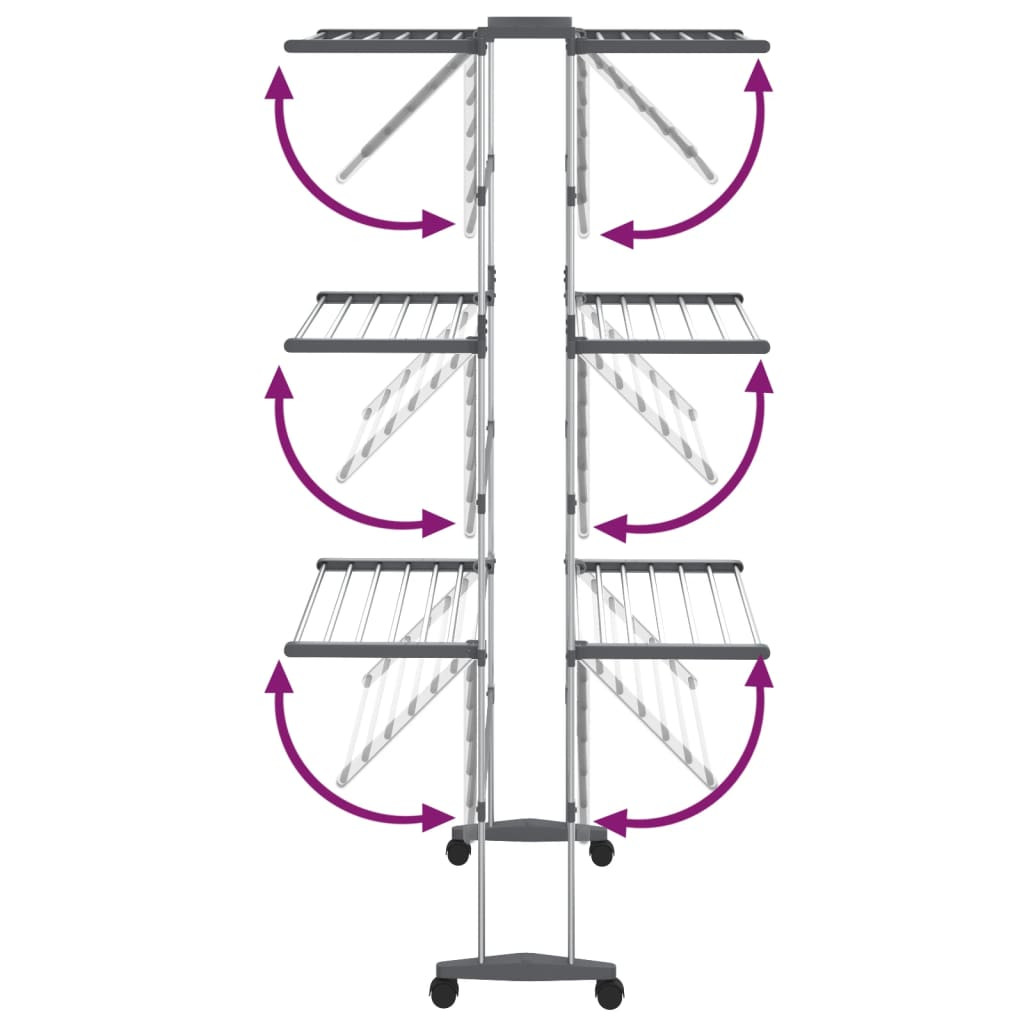 Ez a 3 szintes ruhaszárító állvány ideális választás a korlátozott szárítóhellyel rendelkező otthonokba! Stabil váz: A ruhaszárító állvány alumíniumváza erős szerkezetet és stabilitást biztosít.Összecsukható kialakítás: Mivel a szárító mindegyik szintje külön-külön összecsukható, a ruhaszárító állvány használható csak az egyik oldalán is, ha közvetlenül a falhoz vagy a radiátorhoz helyezi.Könnyen mozgatható: 4 kerékének köszönhetően még akkor is mozgatható, ha teljesen meg van rakva ruhával.