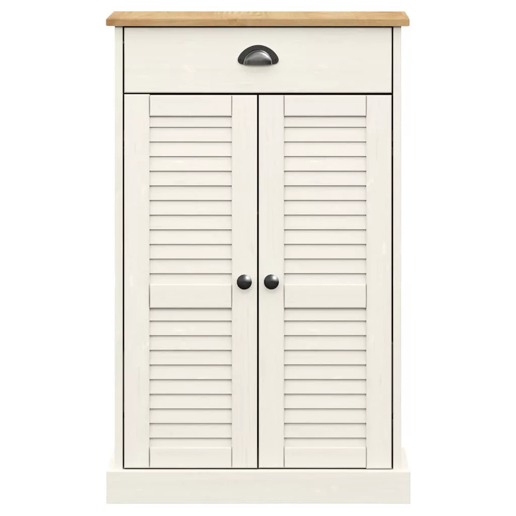 Tartsa cipőit rendben és portól mentesen, és teremtsen takaros környezetet otthonában ezzel az elegáns cipőszekrénnyel! Tömör fenyőfa: A tömör fenyőfa egy gyönyörű természetes anyag. A fenyőfa egyenes erezetű, a csomók pedig jellegzetes, rusztikus megjelenést biztosítanak az anyagnak. A tömör fenyőfából készült cipőszekrény tartós és masszív.Bőséges tárolóhely: Ez a cipőpolc 2 polccal és 1 fiókkal rendelkezik a cipők és apró dolgok rendezett tárolásához.Könnyen karbantartható: A cipőtároló szekrény könnyen tisztítható nedves ruhával, és kevesebb karbantartást igényel.Fém fogantyú és gombok: A cipőszekrény fémfogantyúval és -gombokkal rendelkezik, amelyek megkönnyítik a szekrény kinyitását és zárását, miközben további szépséget kölcsönöznek a bútornak. Figyelem:A felborulás elkerülése érdekében ezt a terméket a mellékelt fali rögzítőeszközzel kell használni.