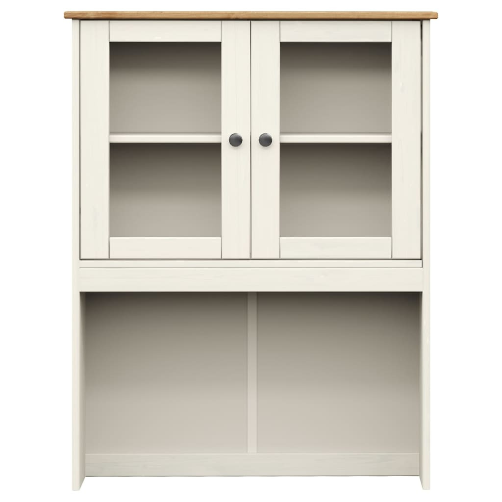 Ez a komód felső ideális megoldást kínál arra, hogy több tárhelyet biztosítson komódjának, tálalójának vagy büféjének. Tömör fenyőfa: A tömör fenyőfa egy gyönyörű természetes anyag. A fenyőfa egyenes erezetű, a csomók pedig jellegzetes, rusztikus megjelenést biztosítanak az anyagnak. Ez a tömör fenyőfából készült komód felső strapabíró és masszív.Bőséges tárolóhely: A polcokkal és üvegajtókkal a komód felső polca gondoskodik az edények, csészék és tálak rendezett és rendezett megjelenítéséről.Könnyen karbantartható: Az üvegvitrines komód felső könnyen tisztítható nedves ruhával, és kevesebb karbantartást igényel.Fém gombok: A konyhai komód felső fém gombokkal lett ellátva, amelyek megkönnyítik a kinyitását és zárását, miközben tovább növelik a szépségét. Figyelem:A felborulás elkerülése érdekében ezt a terméket a mellékelt fali rögzítőeszközzel kell használni.