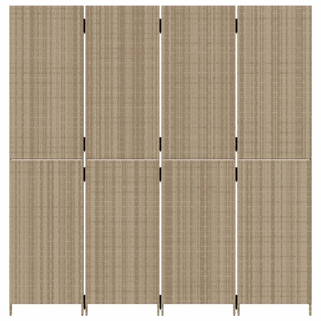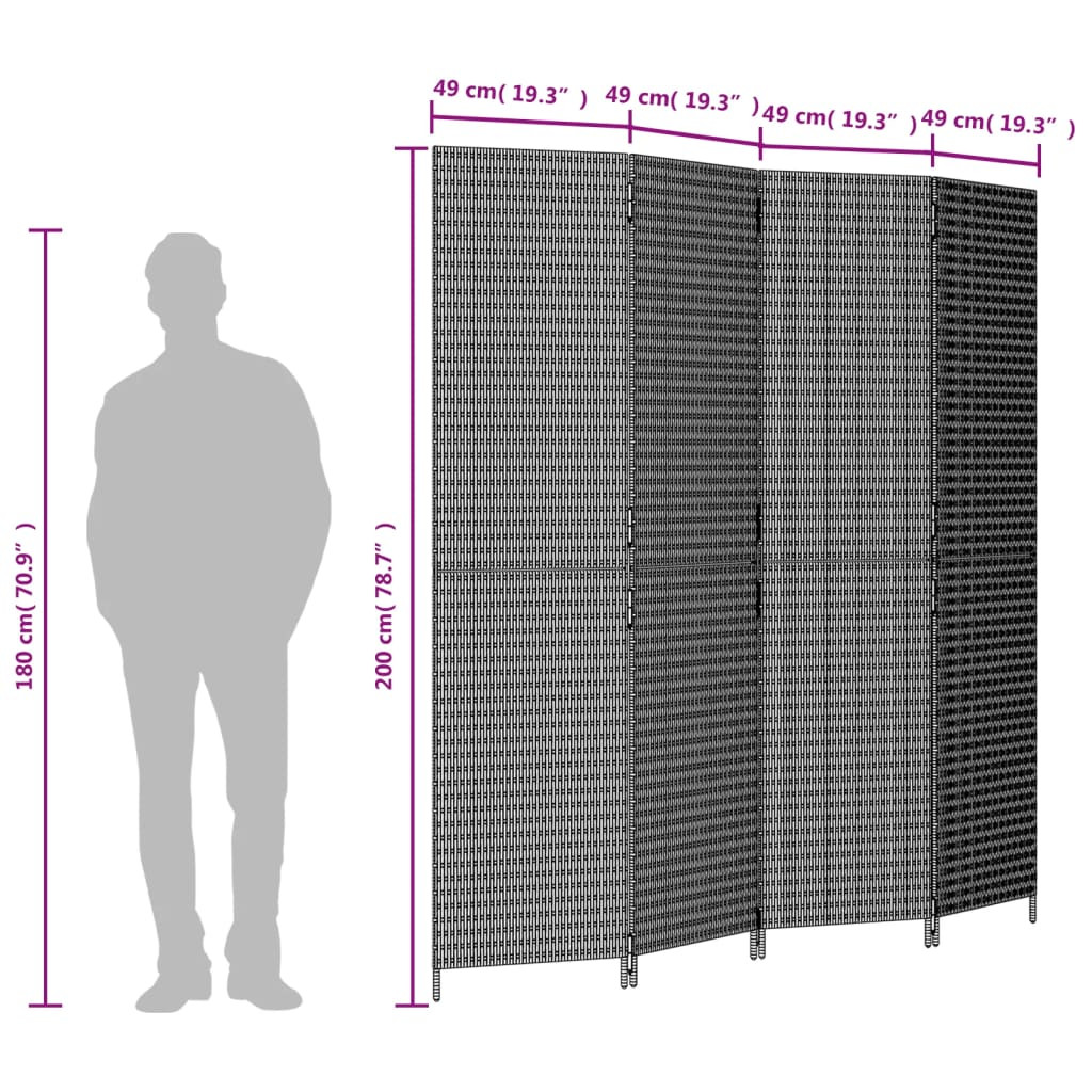 Ékesítse otthonát, és ossza fel terét ezzel a polyrattan térelválasztóval. Tartós és könnyen tisztítható: Minden belátásgátló panel időjárásálló és tartós polyrattan csíkokból lett szőve, így gyönyörű megjelenést biztosít, és könnyen tisztítható.Stabil váz: A porszórt acél váz erős szerkezetet és stabilitást biztosít.Rugalmas és könnyen összecsukható: Minden válaszfalat horganyzott zsanérok kötnek össze, és bizonyos mértékig a helytakarékosság érdekében igény szerint könnyedén összehajthatóak.Többcélú: A térelválasztó paraván bel- és kültéren egyaránt kiválóan alkalmas privát terek kialakítására, például a hálószobában, a nappaliban, az irodában stb. Az ablak elé is elhelyezheti, hogy megelőzze az intenzív napfény beáramlását. Fontos jegyzet:Ahhoz, hogy teljesen laposra lehessen hajtani, szét kell szerelni a horganyzott zsanérokat.