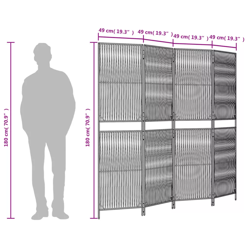 Ékesítse otthonát, és ossza fel terét ezzel a polyrattan térelválasztóval. Tartós és könnyen tisztítható: Minden belátásgátló panel polyrattanból készült, ami időjárásálló, tartós és könnyen tisztítható.Stabil váz: A porszórt acél váz erős szerkezetet és stabilitást biztosít.Rugalmas és könnyen összecsukható: Minden válaszfalat horganyzott zsanérok kötnek össze, és bizonyos mértékig a helytakarékosság érdekében igény szerint könnyedén összehajthatóak.Vonalszőtt kialakítás: A vonalszőtt kialakításnak köszönhetően ez a szobaparaván stílusos és művészi úton garantálja magánélete védelmét, ugyanakkor a helyiségnek szellőzést és világosságot biztosít.Többcélú: A térelválasztó paraván bel- és kültéren egyaránt kiválóan alkalmas privát terek kialakítására, például a hálószobában, a nappaliban, az irodában stb. Az ablak elé is elhelyezheti, hogy megelőzze az intenzív napfény beáramlását. Fontos jegyzet:Ahhoz, hogy teljesen laposra lehessen hajtani, szét kell szerelni a horganyzott zsanérokat.