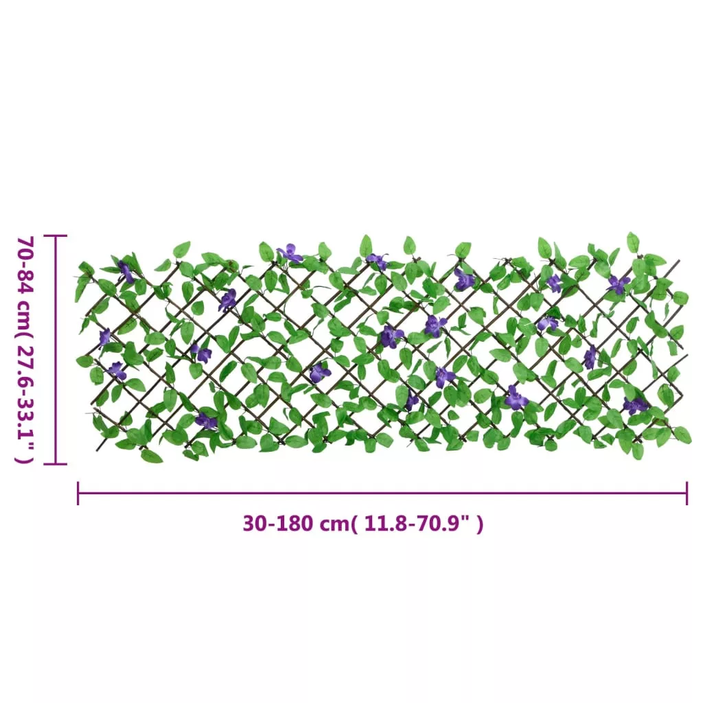 Ezzel a műborostyánráccsal kerti falakat díszíthet, és privát kültéri környezetet alakíthat ki. Magánélet és dekoráció: Ez a műborostyánrács magánéletet és biztonságot biztosít kültéri környezete számára, és nagyszerű lehetőség a ház díszítésére, mivel elzárja az erős napfényt, miközben biztosítja a levegő természetes áramlását.Bővíthető: A bővíthető kerítés szélessége 30 és 180 cm között, magassága pedig 70 és 84 cm között állítható. Saját igényeinek megfelelően állíthatja be.Masszív felépítés: A műborostyán-paraván tartós fából készült, így masszív szerkezetű, és hosszú ideig használható.Könnyen karbantartható: A valósághű és természetes virágok és levelek PVC-ből készültek, így nem igényelnek öntözést vagy rovarirtást, és víztömlővel könnyen tisztíthatók.Széleskörű felhasználás: A borostyánkerítés rugalmas, és bármilyen felületen használható. Tökéletes falak vagy kertje egyéb csúnya részeinek letakarására.