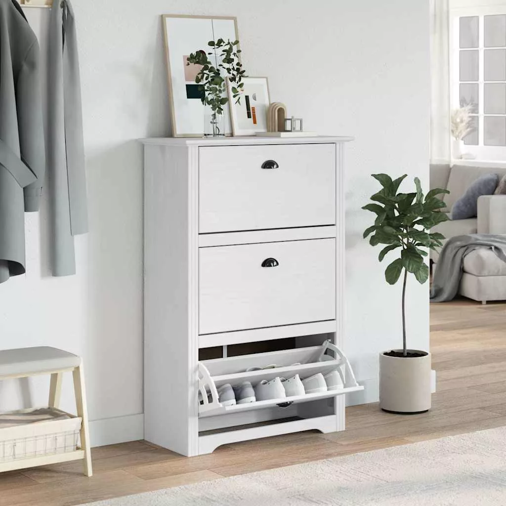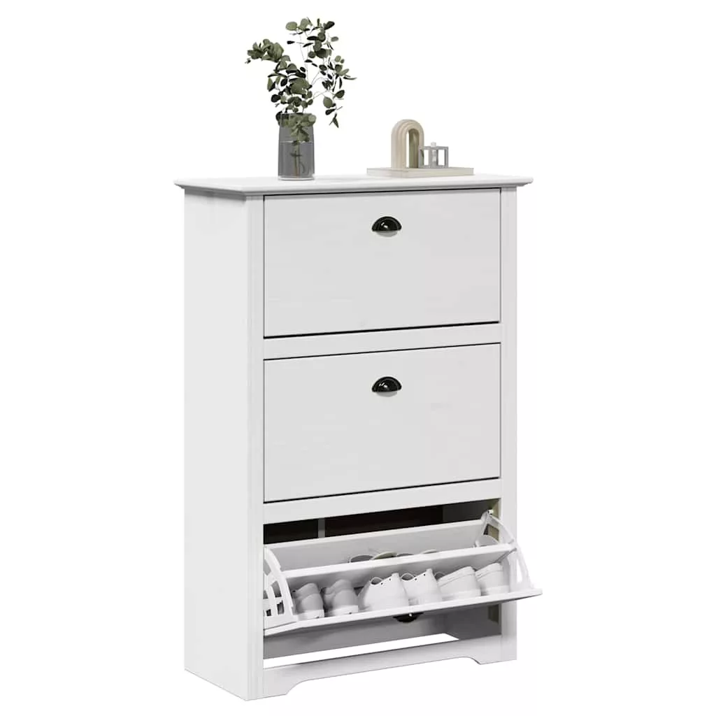 Tartsa cipőit rendben, és teremtsen takaros környezetet ezzel az elegáns cipőtartóval! Tartós anyag: A tömör fenyőfa erősségéről és tartósságáról ismert. Egyenes erezete és jellegzetes csomói hozzájárulnak rusztikus varázsához. A szerelt fa tartós és stabil anyag sima felülettel, amely ellenáll a nedvességnek, a vetemedésnek és a hasadásnak, így megbízható választás különféle célokhoz.Bőséges tárolóhely: A cipőszekrény 3 fiókkal rendelkezik, így bőséges helyet biztosít a cipők tárolására. Ezzel a praktikus cipőtárolóval nem fog többé bosszankodni azon, hogy a lábbelik elfoglalják az egész padlót.Gyakorlati csúcs: A cipőtároló stabil felső polca ideális dekorációs tárgyak, képkeretek elhelyezésére, vagy olyan dolgok tárolására, mint a kulcsok vagy pénztárcák, amelyekre elérhető közelségben lehet szükséged.Könnyen használható: A fiókok fém fogantyúi kényelmessé teszik a nyitást és zárást, és vonzóbbá teszik a cipősszekrényt.Könnyen karbantartható: A cipőszervezőt sima felületének köszönhetően könnyű tisztítani, és csak egy száraz ruhával kell áttörölni. Jó tudni:A falon belüli csavarok és dugók nem alaptartozékok. Azt tanácsoljuk, hogy keressen és használjon kifejezetten az Ön falához megfelelő csavarokat és dugókat. Ha nem biztos benne, konzultálhat egy szakemberrel. Kérjük, olvassa el és kövesse az utasítások minden lépését. Figyelem:A felborulás elkerülése érdekében ezt a terméket a mellékelt fali rögzítőeszközzel kell használni.