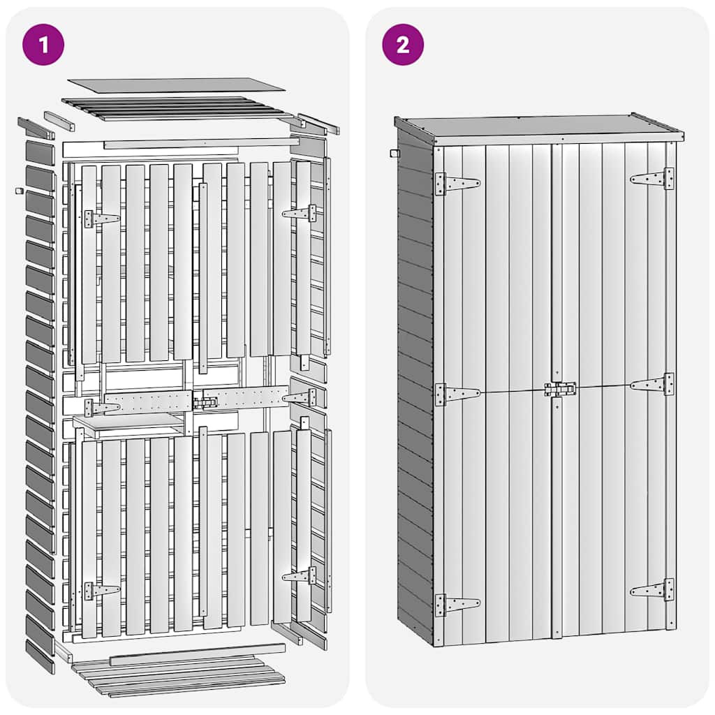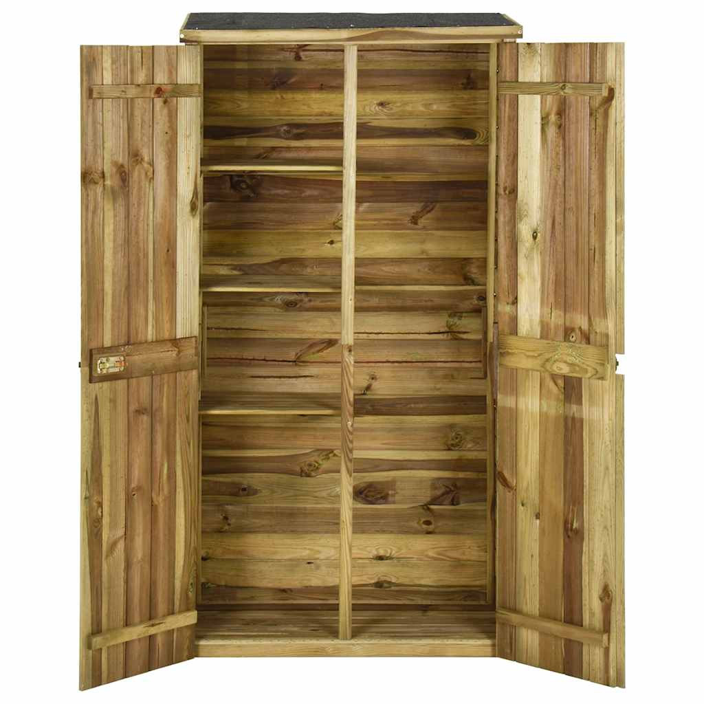 Ez a fa tárolókamra rusztikus bájával hasznos kiegészítő lesz a teraszon, udvaron vagy a kertben. 3 polcával és 1 nagy fiókjával a kerti fészer bőséges helyet biztosít szerszámoknak, kerti eszközöknek és sok egyébnek. Ez a kültéri tárolószekrény fenyőfából készült, ami környezetbarát. Az impregnált fenyő strapabíró, időjárásálló és nem korhad. Ezenkívül a tető vízhatlan kátránypapír filccel van bélelve. A fából készült tárolószekrény összeszerelése egyszerű. Felhívjuk figyelmét, hogy a fa természetes anyag, így előfordulhatnak rajta tökéletlenségek.