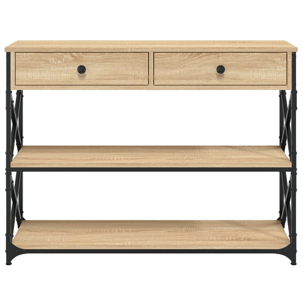 Adjon egy csipetnyi eleganciát bejáratához, nappalijához vagy folyosójához ezzel a stílusos konzolasztallal. Tartós anyag: A szerelt fa kivételes minőségű, sima felületű, szilárd, stabil, és ellenáll a nedvességnek. A szerelt fából készült kanapéasztal könnyen tisztítható.Bőséges tárolóhely: Az előszoba asztal bőséges tárhelyet kínál folyóiratai, könyvei, dísztárgyai és egyéb fontos tárgyai rendezett és elérhető helyen tartásához.Állítható láb: A négy, műanyag talppal ellátott láb egyensúlyban tartja az előszoba asztalt az egyenetlen talajon, valamint fokozza a stabilitást.Fémváz: A fémváz ipari stílust csempész otthonába, és az erőről, a stabilitásról is gondoskodnak. Az előszobaasztal X-alakú keresztrudakkal rendelkezik a nagyobb stabilitás érdekében, így nem kell aggódnia a padlón való lötyögéstől. Figyelem:A felborulás elkerülése érdekében ezt a terméket a mellékelt fali rögzítőeszközzel kell használni.