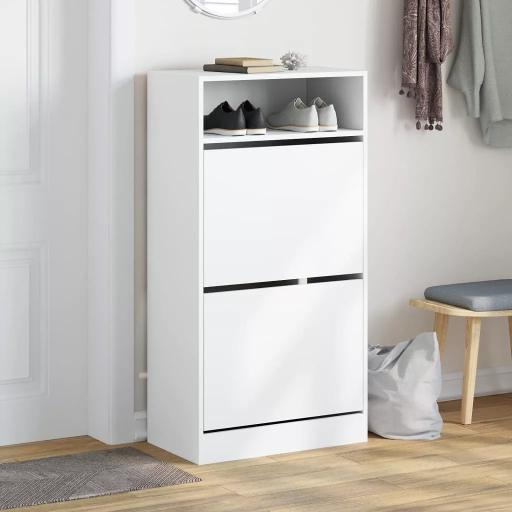 Ez a cipőszekrény kompakt kialakításának köszönhetően kiváló választás cipői rendszerezett tárolására, különösen keskeny és szűk helyeken. Tartós anyag: A szerelt fa kivételes minőségű, sima felületű, szilárd, stabil, és ellenáll a nedvességnek.Bőséges tárolóhely: Ez a cipőtartó 1 polccal és 2 kihajtható fiókkal rendelkezik, melyek elegendő helyet biztosítanak a cipők kéznél tartásához és rendezett tárolásához.Praktikus felső lap: A cipőszekrény erős teteje ideális dísztárgyak, például képkeretek vagy cserepes növények elhelyezésére.Helytakarékos kialakítás: A vékony cipőtároló szekrényt úgy tervezték, hogy tökéletesen illeszkedjen olyan kis helyekre, mint az előszoba, folyosó, mosókonyha stb. Figyelem:A felborulás elkerülése érdekében ezt a terméket a mellékelt fali rögzítőeszközzel kell használni.