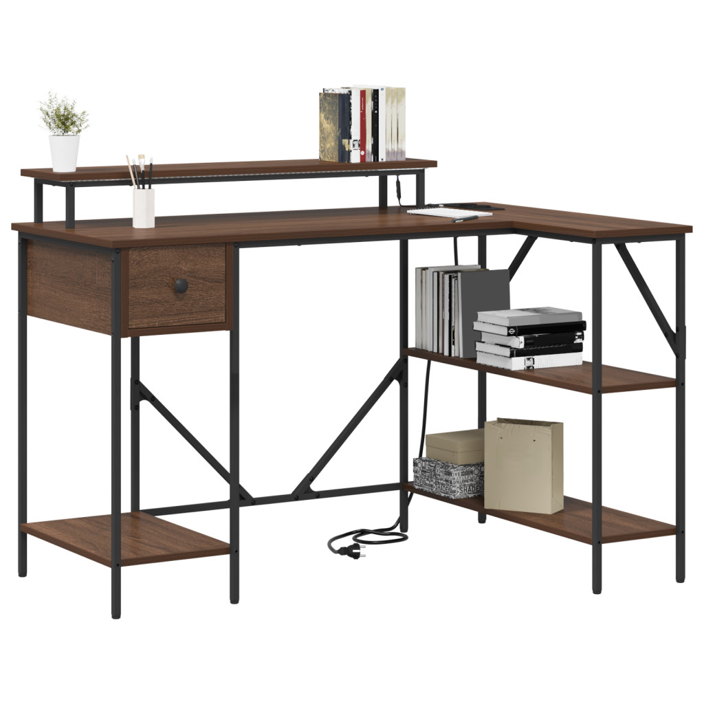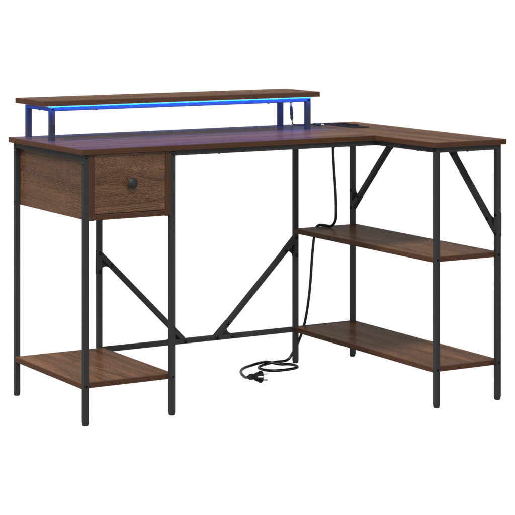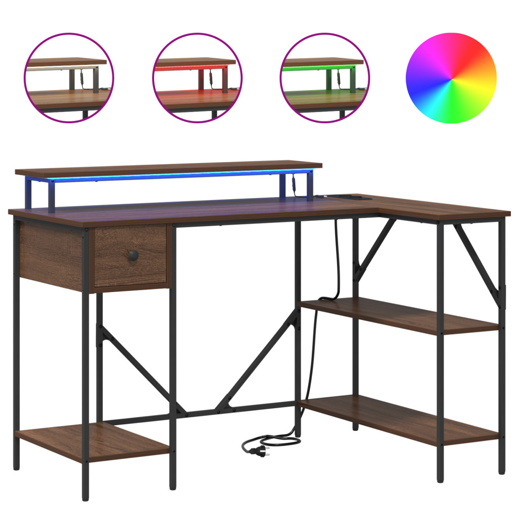 Asztal LED -es lámpákkal fiókkal polcokkal tárolóval barna tölgy 120 x 79 x 86.5 cm Faanyag